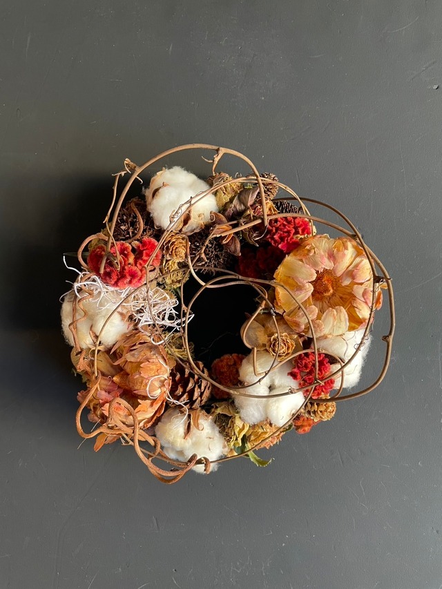 コットンや実物をしっかり使用した、これからの季節にぴったりなリース 【使用花材】 コットン ケイトウ サルフレア・ステム サンキライツル スプレーバラ ゴアナクロー サンキライ 松ぼっくり 【サイズ】 縦23㎝×横23㎝ ※多少、大きさが前後する場合があります。 【メッセージカード無料サービス】 メッセージカードご希望の場合は下記よりお選び頂き、備考欄にご記入下さい。 1.Happy birthday 2.Happy wedding 3.Congratulations 4.Thank you 5.無地カード 【ドライフラワーの取扱について】 ドライフラワーはとてもデリケートな商品となってます。梱包には十分注意をしておりますが、配送中に花こぼれや多少の破損がある場合がございます。 ご理解の程、よろしくお願い致します。 ・受付後のキャンセルは出来かねます。 ・お届け日時を下記からお選び、備考欄にご記入下さい。 ⚪︎お届け希望日 ⚪︎お時間帯(午前中、14時〜16時、16時〜18時、18時〜20時、19時〜21時) ご指定のない場合はご決済後、最短発送致します。混雑時は2〜3日程度で発送致します。 ・ギフト希望の場合は、備考欄にご記入下さい。ラッピングペーパー、リボンのお色はお花に合わせてお任せ頂いております。