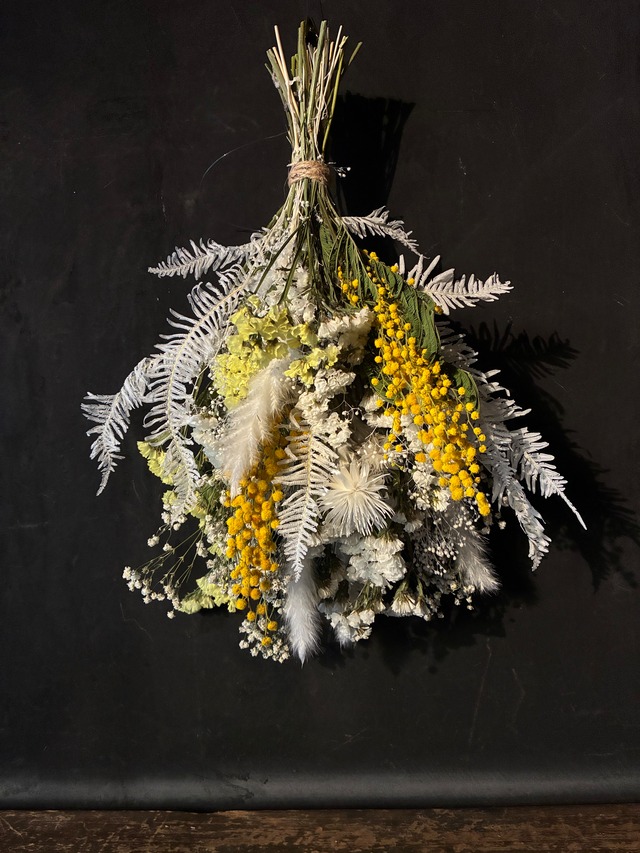 ミモザの温かみのある黄色を基調に、シックな雰囲気に仕上げました。 【使用花材】 ミモザ ユーカリ スターチス クラスペディア ヤシ 【サイズ】 縦41㎝×横39㎝ ※多少、大きさが前後する場合があります。 【メッセージカード無料サービス】 メッセージカードご希望の場合は下記よりお選び頂き、備考欄にご記入下さい。 1.Happy birthday 2.Happy wedding 3.Congratulations 4.Thank you 5.無地カード 【ドライフラワーの取扱について】 ドライフラワーはとてもデリケートな商品となってます。梱包には十分注意をしておりますが、配送中に花こぼれや多少の破損がある場合がございます。 ご理解の程、よろしくお願い致します。 ・受付後のキャンセルは出来かねます。 ・お届け日時を下記からお選び、備考欄にご記入下さい。 ⚪︎お届け希望日 ⚪︎お時間帯(午前中、14時〜16時、16時〜18時、18時〜20時、19時〜21時) ご指定のない場合はご決済後、最短発送致します。混雑時は2〜3日程度で発送致します。 ・ギフト希望の場合は、備考欄にご記入下さい。ラッピングペーパー、リボンのお色はお花に合わせてお任せ頂いております。