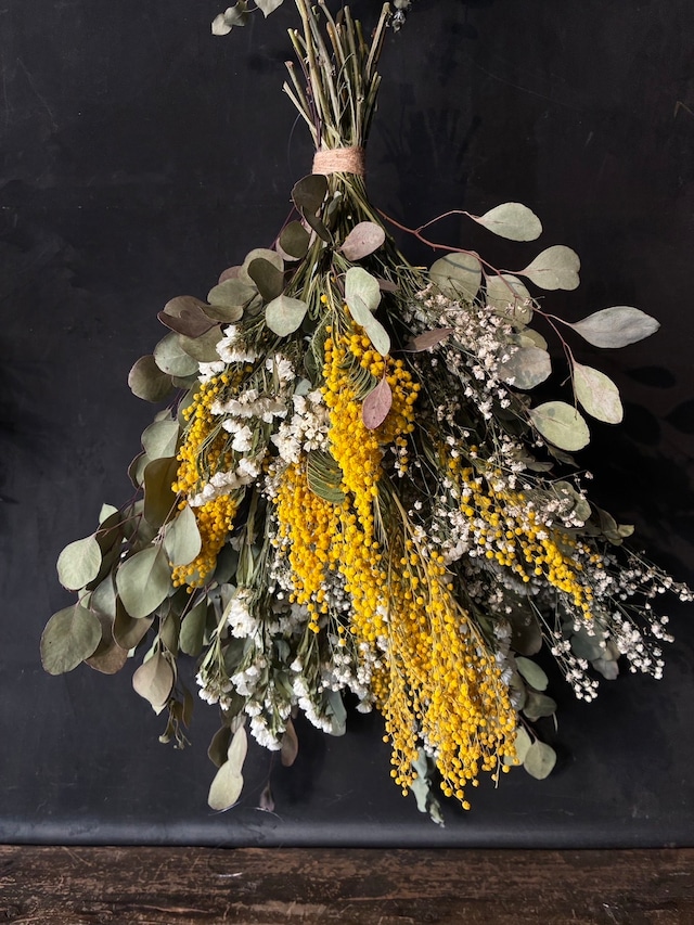 春を感じさせるミモザの優しい色合いとユーカリがどんなお部屋にもぴったりとマッチします。 【使用花材】 ミモザ ユーカリポポラス かすみ草 スターチス シダ 【サイズ】 縦73㎝×横52㎝ ※多少、大きさが前後する場合があります。 【メッセージカード無料サービス】 メッセージカードご希望の場合は下記よりお選び頂き、備考欄にご記入下さい。 1.Happy birthday 2.Happy wedding 3.Congratulations 4.Thank you 5.無地カード 【ドライフラワーの取扱について】 ドライフラワーはとてもデリケートな商品となってます。梱包には十分注意をしておりますが、配送中に花こぼれや多少の破損がある場合がございます。 ご理解の程、よろしくお願い致します。 ・受付後のキャンセルは出来かねます。 ・お届け日時を下記からお選び、備考欄にご記入下さい。 ⚪︎お届け希望日 ⚪︎お時間帯(午前中、14時〜16時、16時〜18時、18時〜20時、19時〜21時) ご指定のない場合はご決済後、最短発送致します。混雑時は2〜3日程度で発送致します。 ・ギフト希望の場合は、備考欄にご記入下さい。ラッピングペーパー、リボンのお色はお花に合わせてお任せ頂いております。