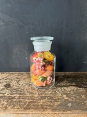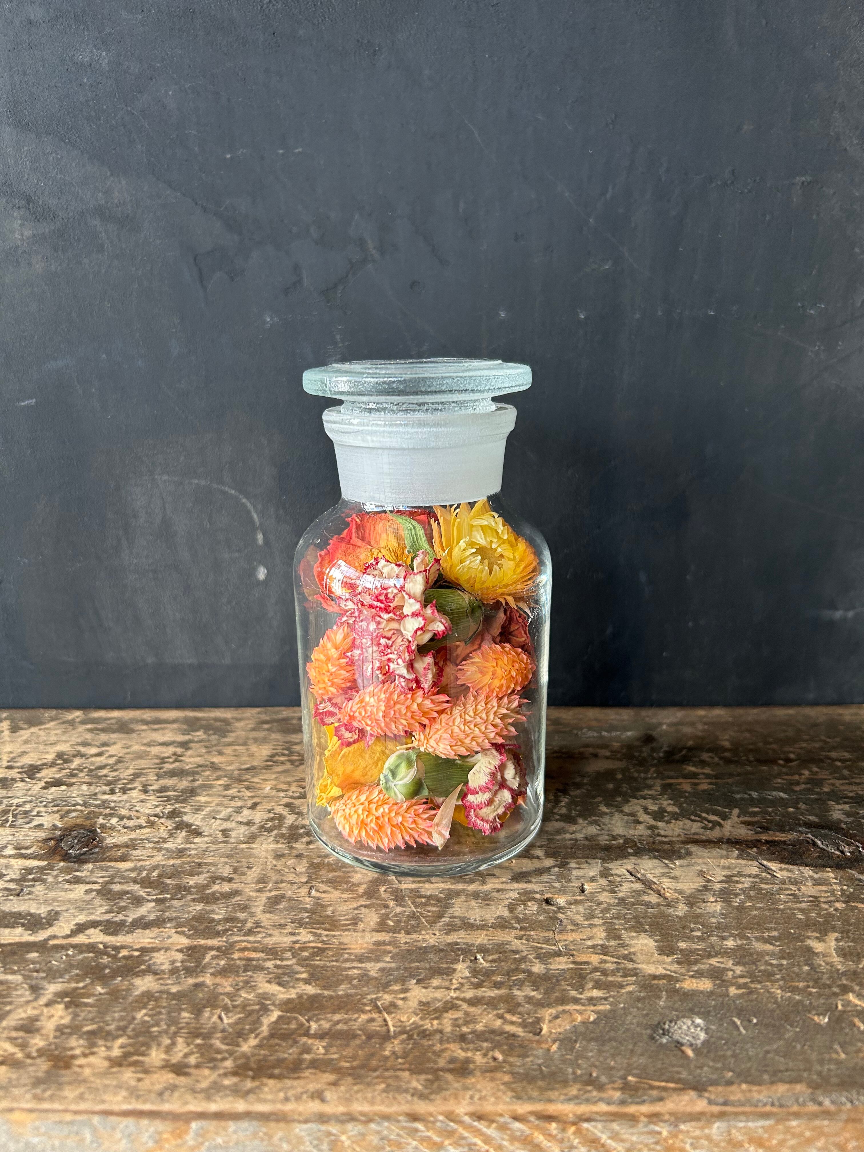 透明な薬瓶に花材を詰め込み、置くだけで様になるボトルフラワーにしました。