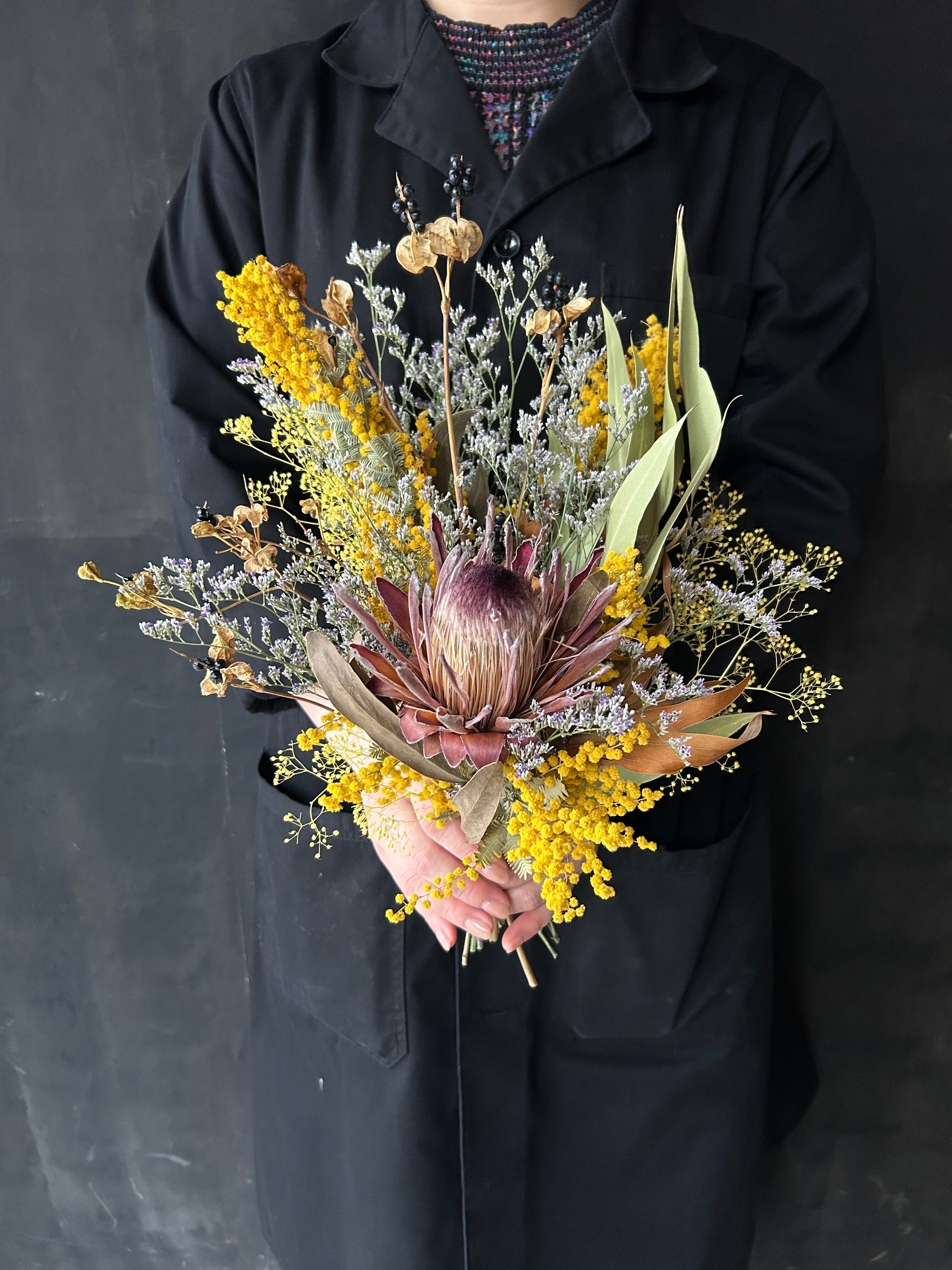 プロテア、ミモザ、ヒオウギ、ソフトカスミソウ、ユーカリ、スターチスブルーウェーブ