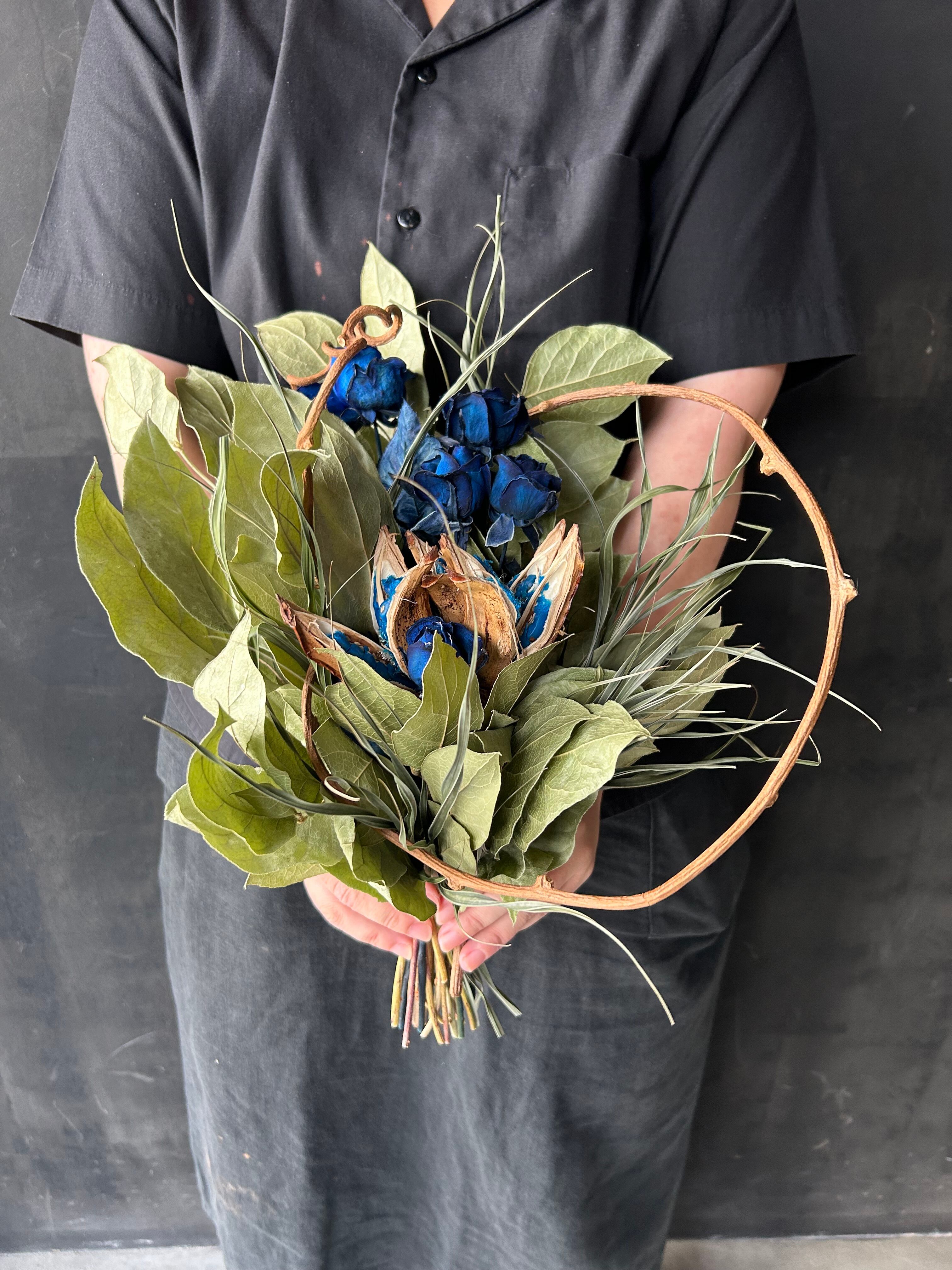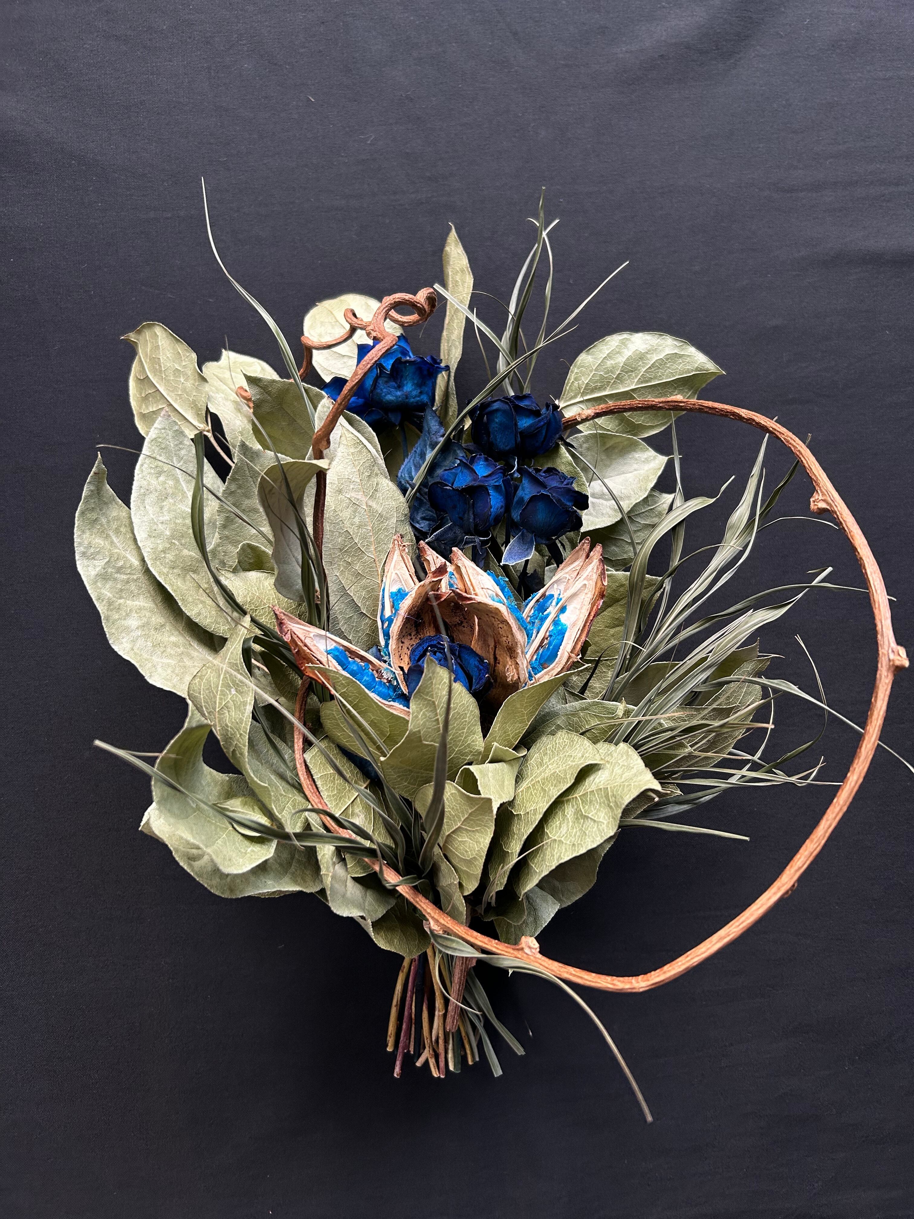 鮮やかな青い種が特徴的な旅人の木を使ったスワッグ