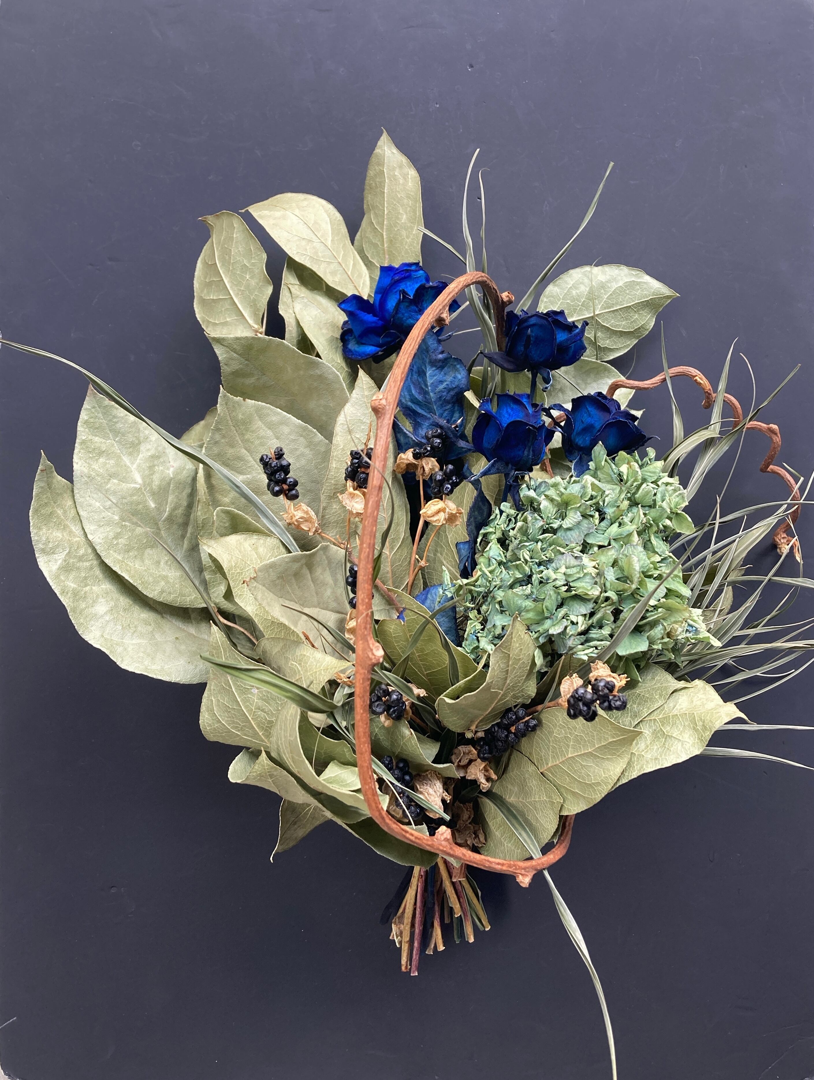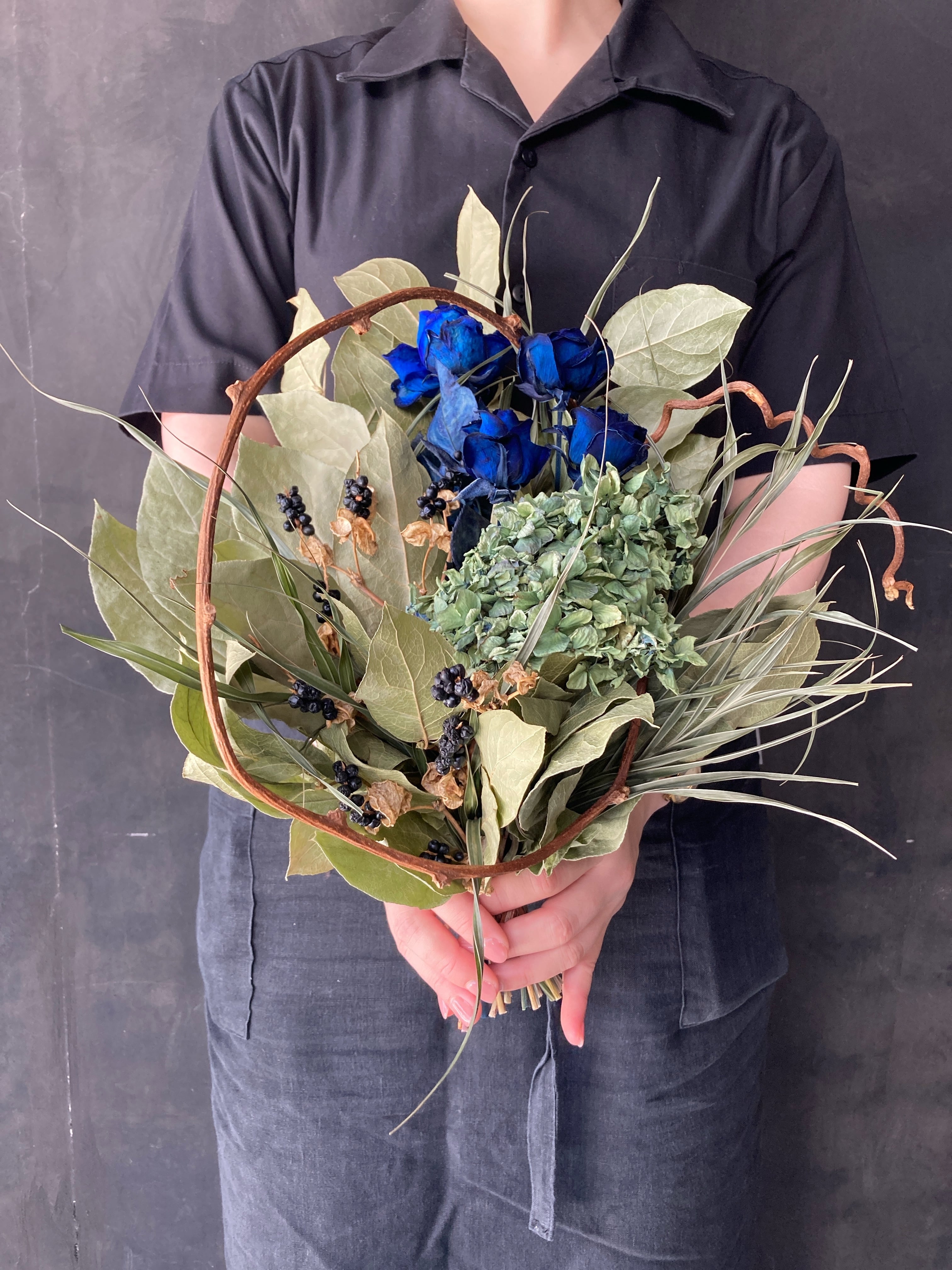 ナチュラルなグリーンをしっかり使用し、アクセントに青薔薇、紫陽花を使用したナチュラルスワッグ。