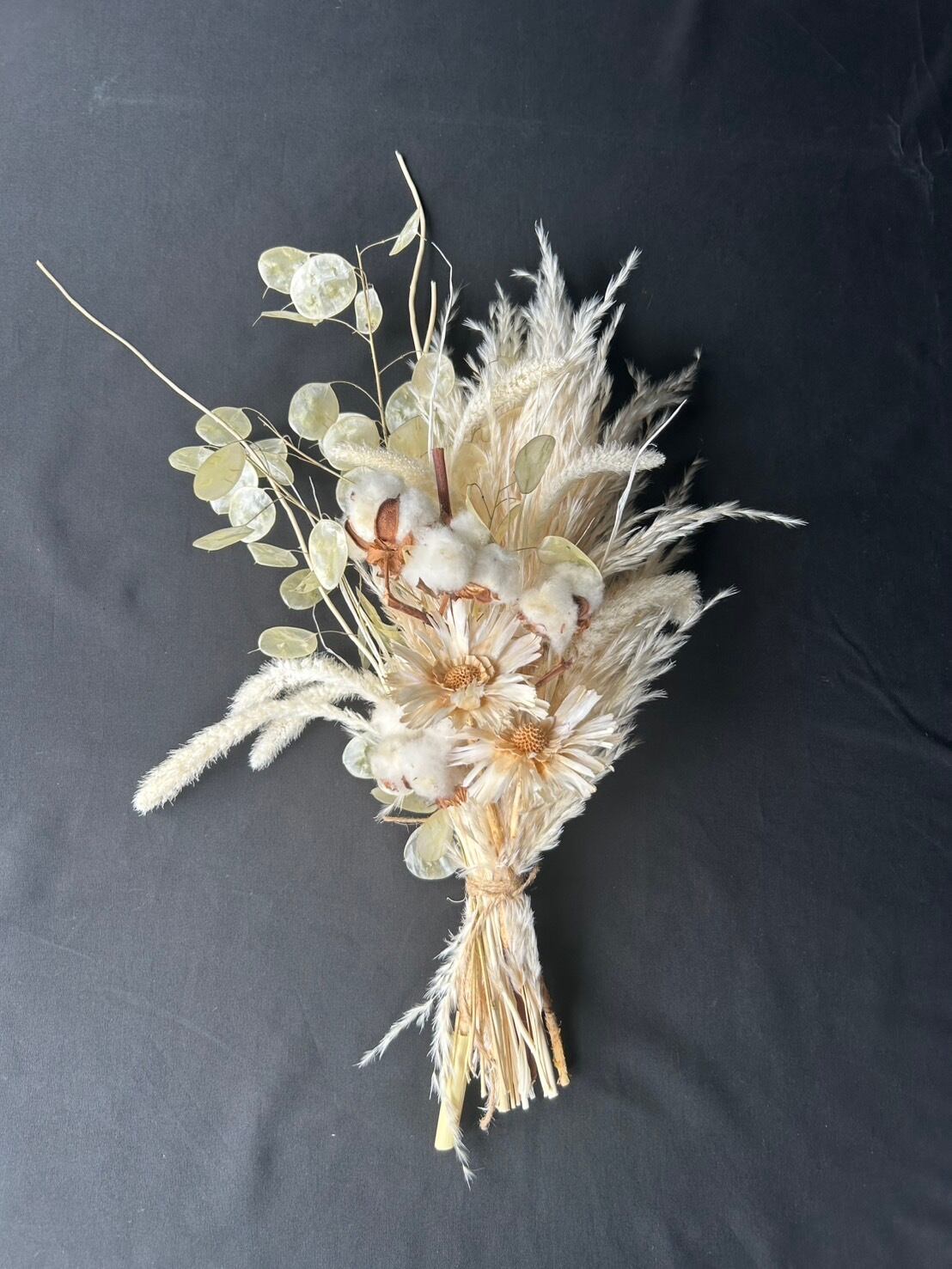 パンパスグラス、ルナリアをしっかり使用しました。白ベージュにまとめたドライフラワーらしい色合いです。