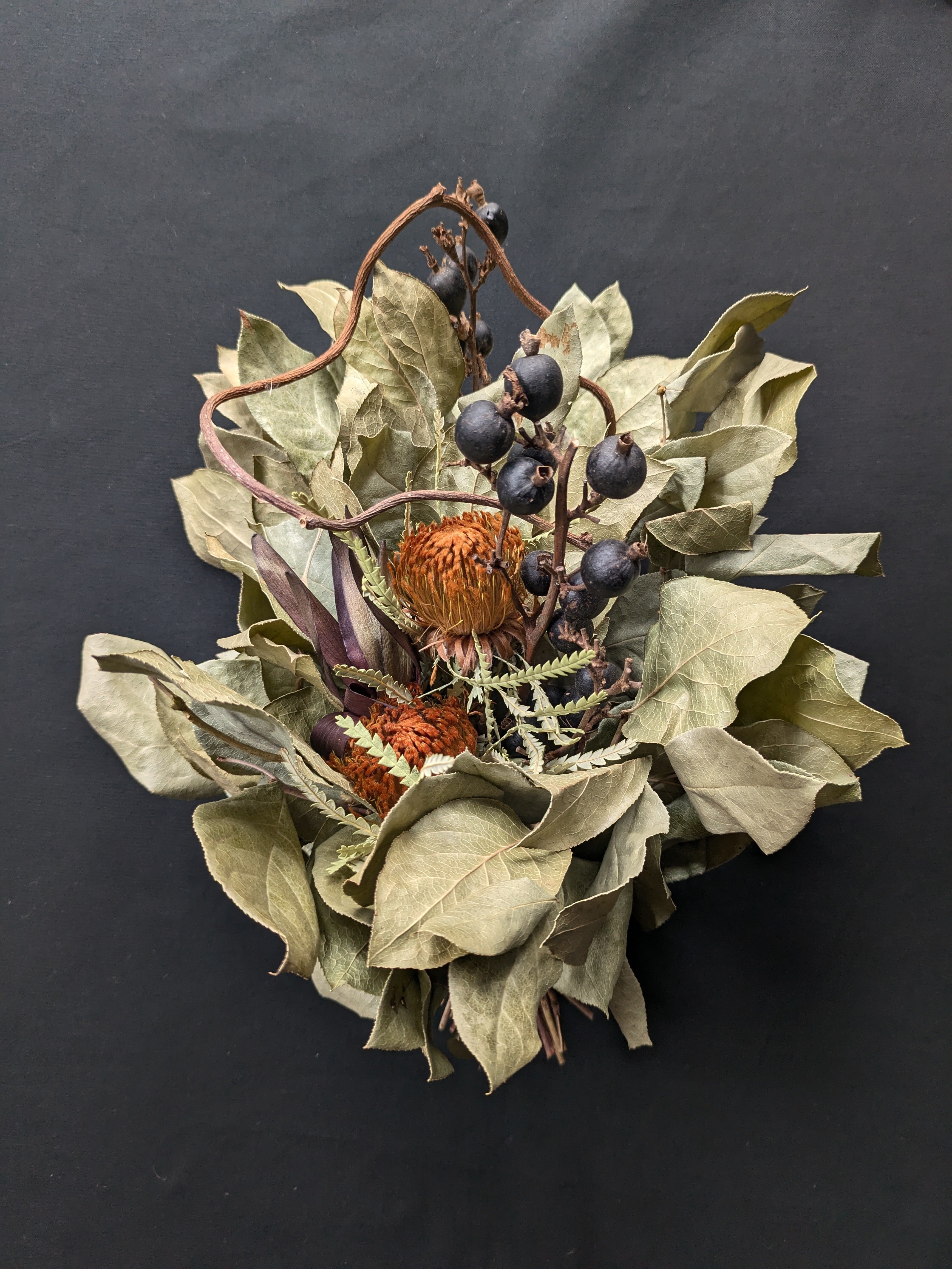 たっぷりのレモンリーフを使用したナチュラルスワッグ。キウイのツルを使用して動きを出しました。