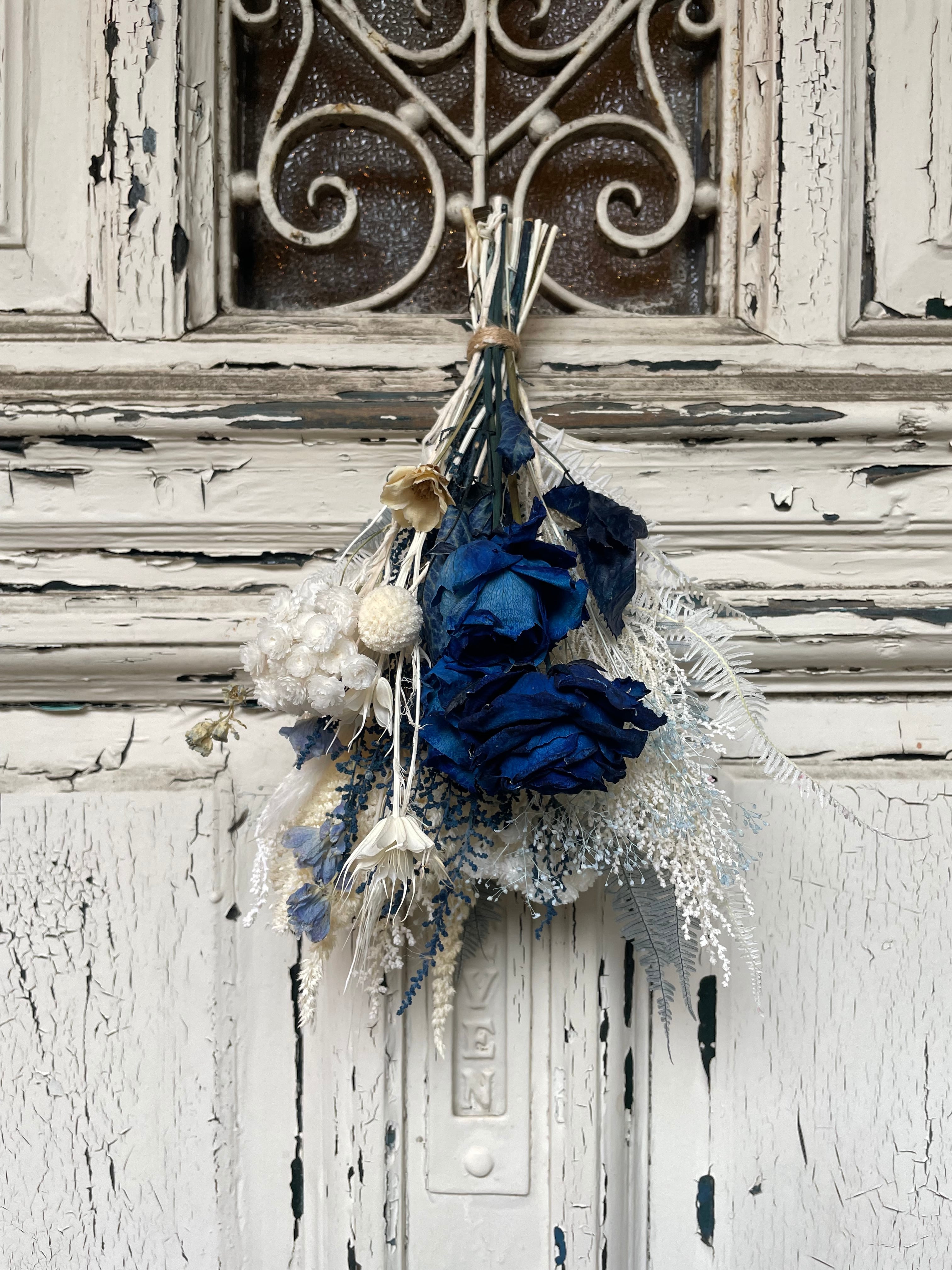 人気の白ベースに青花材を使用したスワッグ。