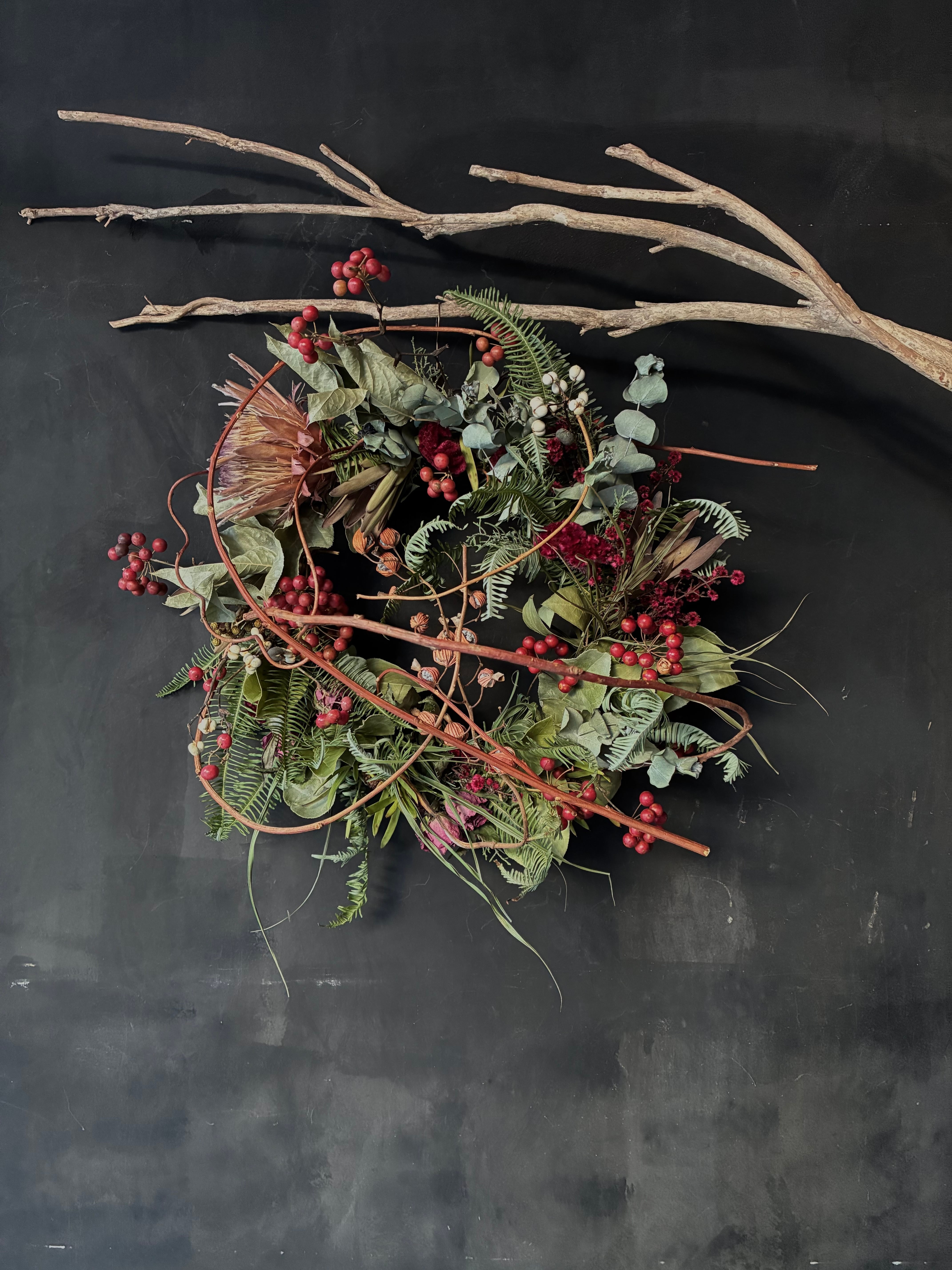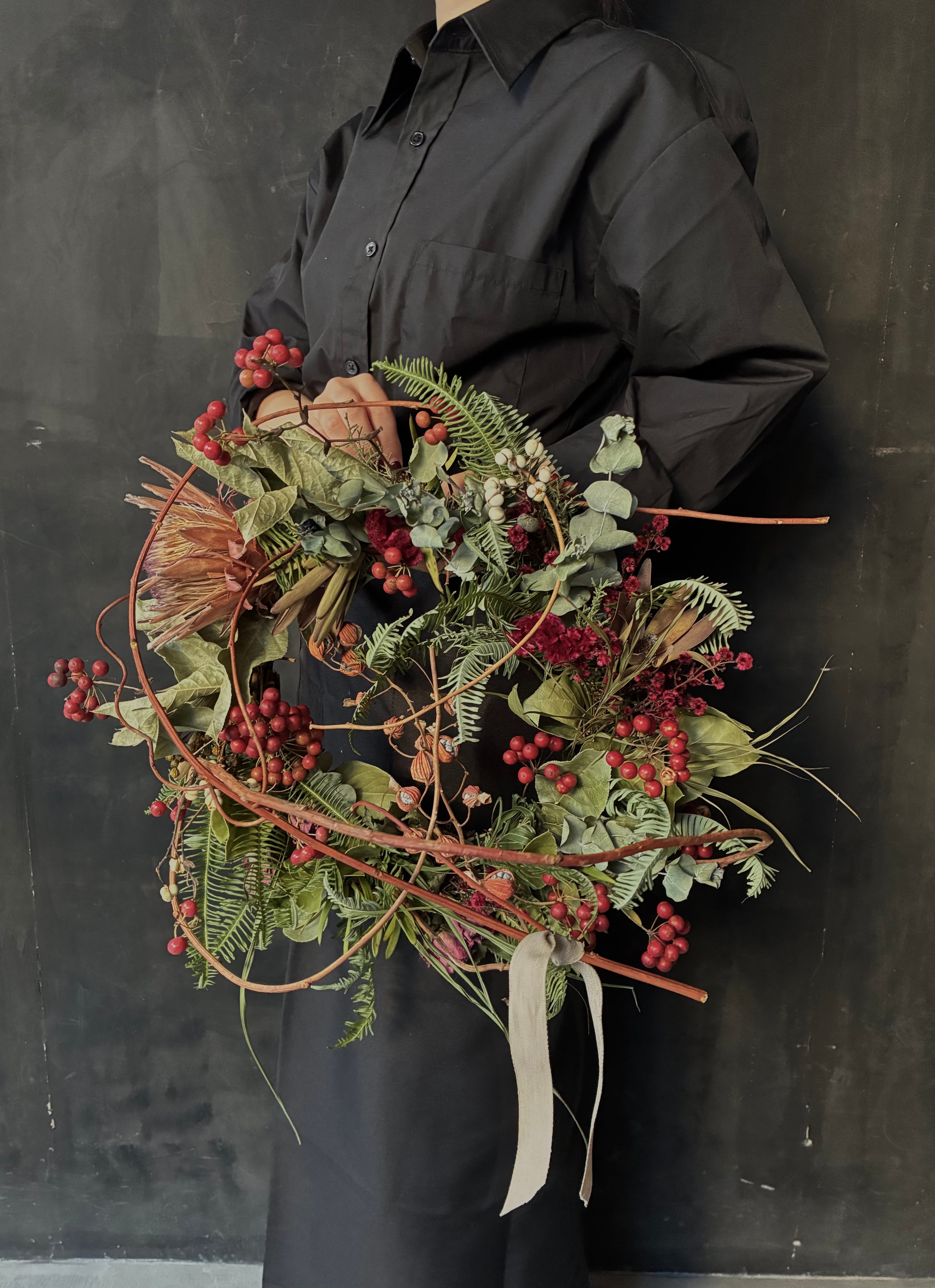 グリーンベースにプロテアをメインに様々な花材を使用して作成しました。