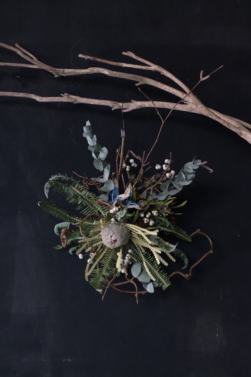 旅人の木を使用し、バンクシアをメインに全体にキウイのツルで動きを出しました。