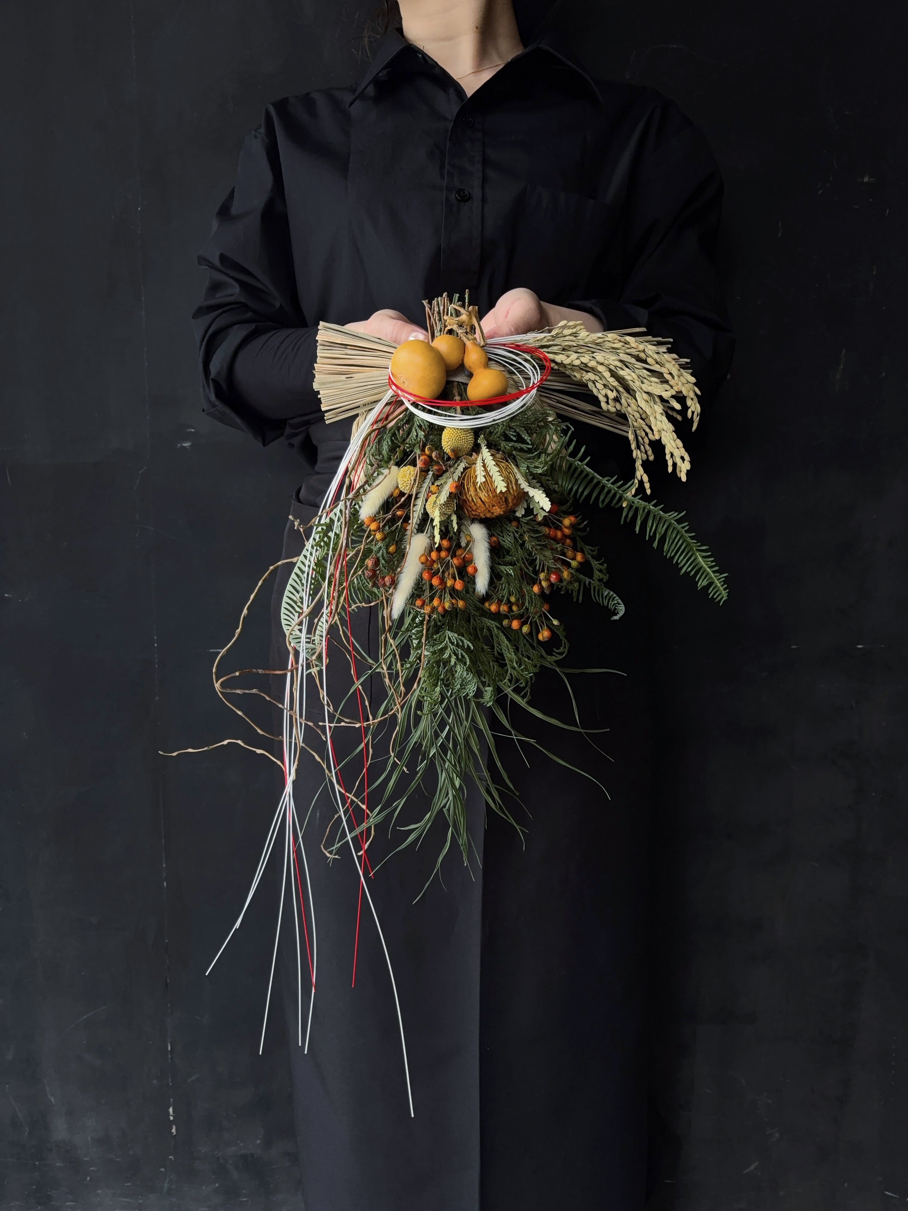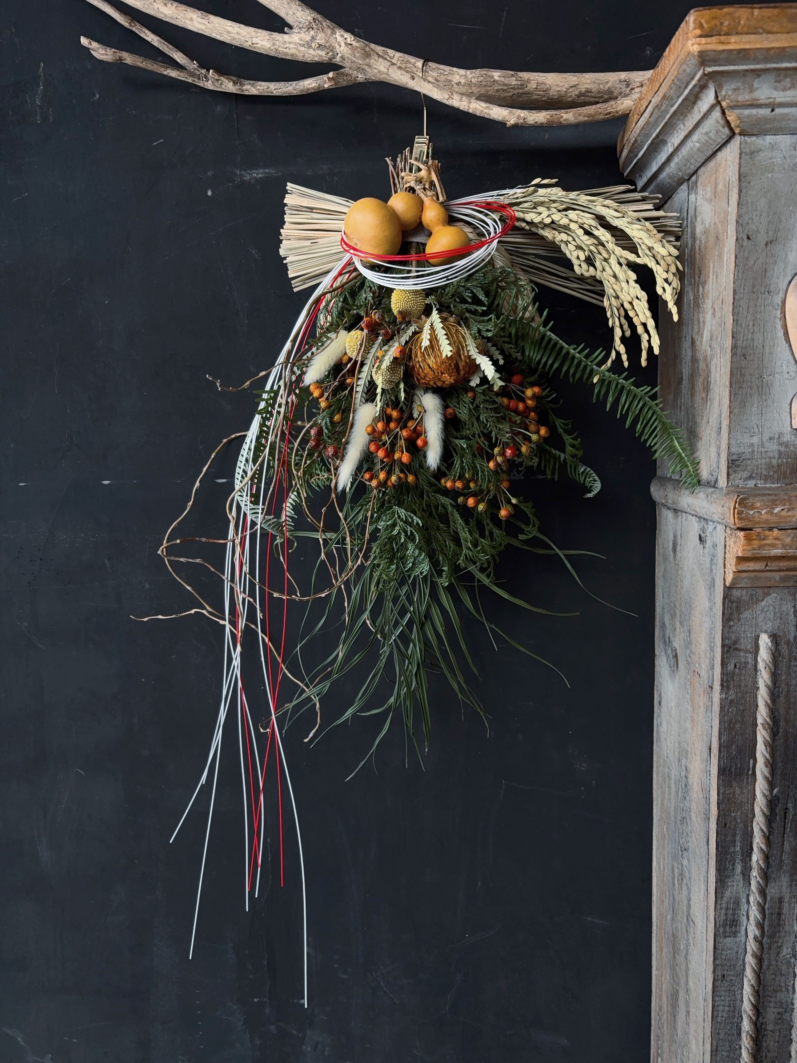 花材にボリューム感をだし全体的動きのあるしめ縄。