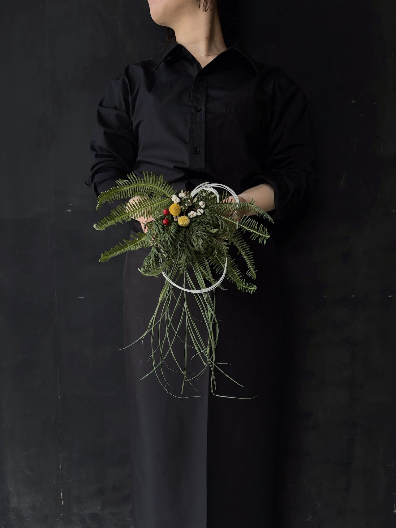 しっかりとグリーン花材を使用し、ナンキンハゼ、サンキライ、クラスペディアをアクセントに仕上げました。