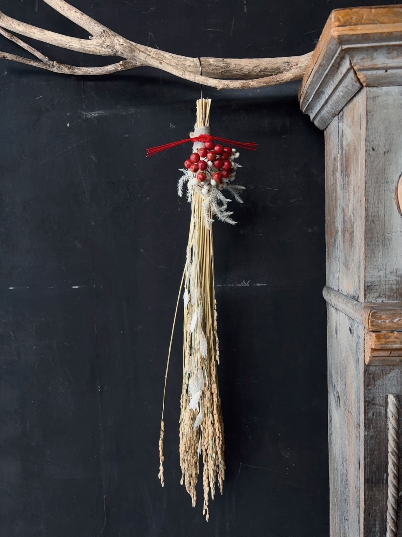 コメを使用し正月らしく、ハンキンハゼとサンキライで紅白をイメージして作りました。