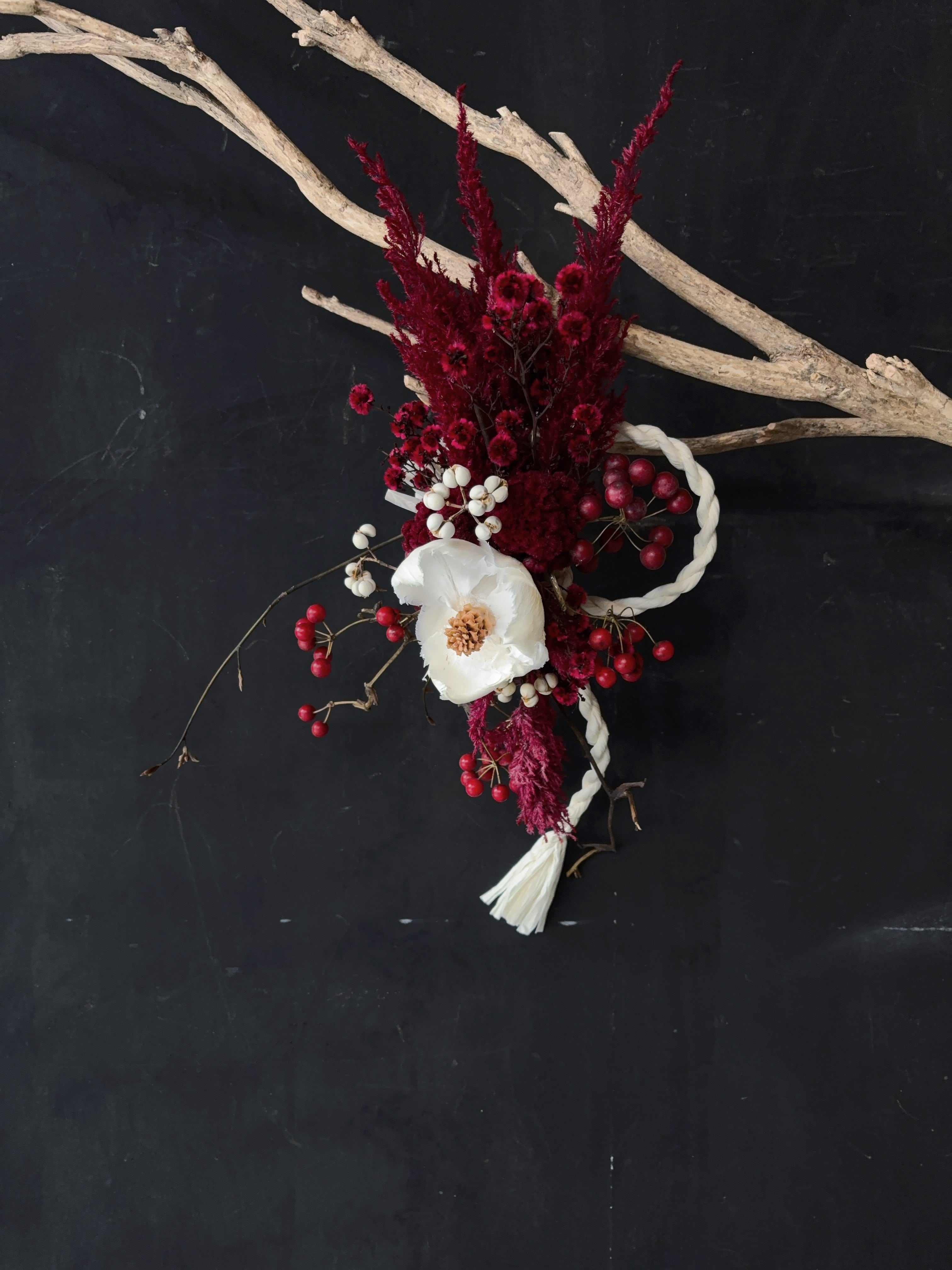 紅白の花材を使用し、お正月らしい色合いで作成しました。