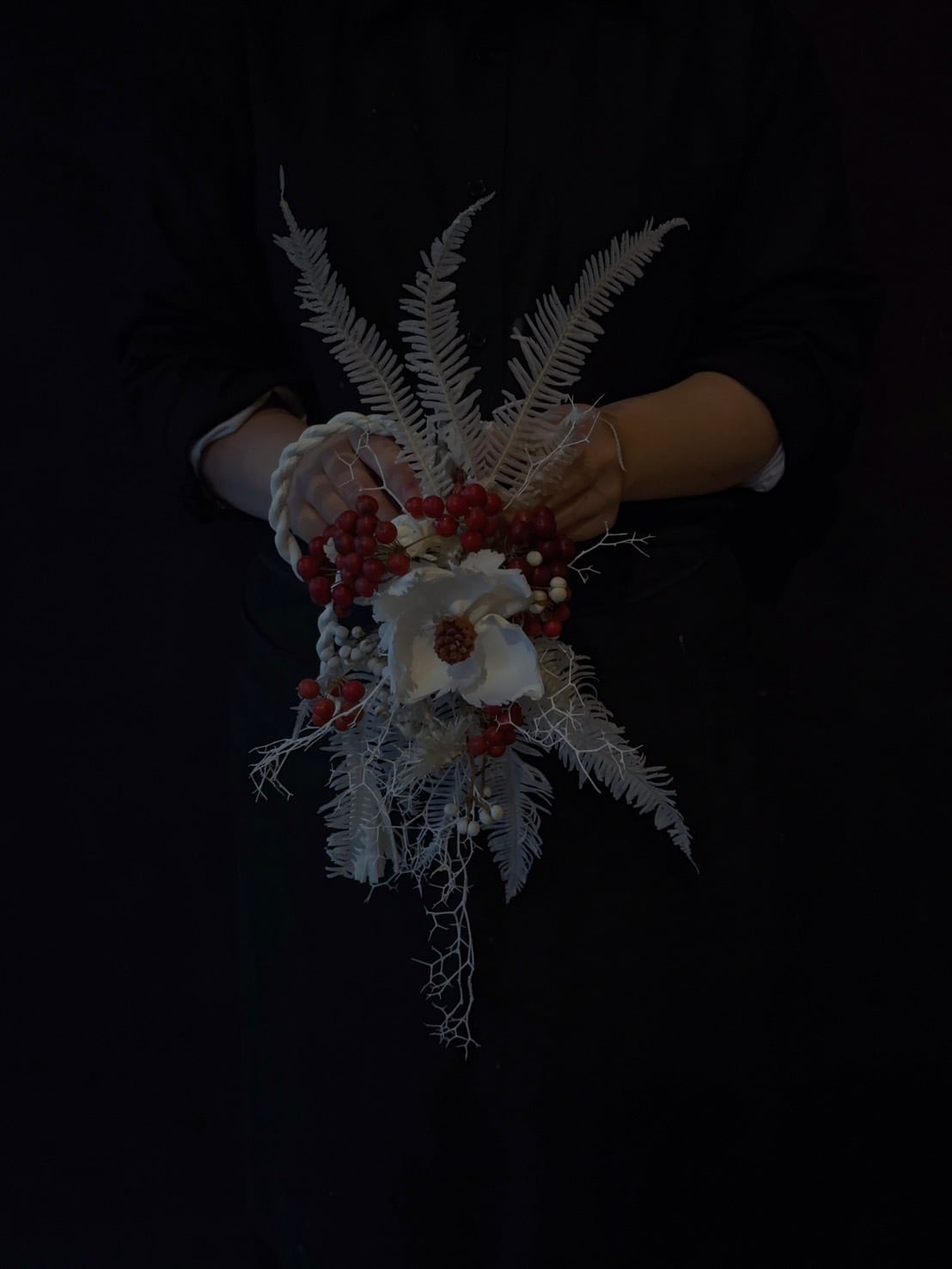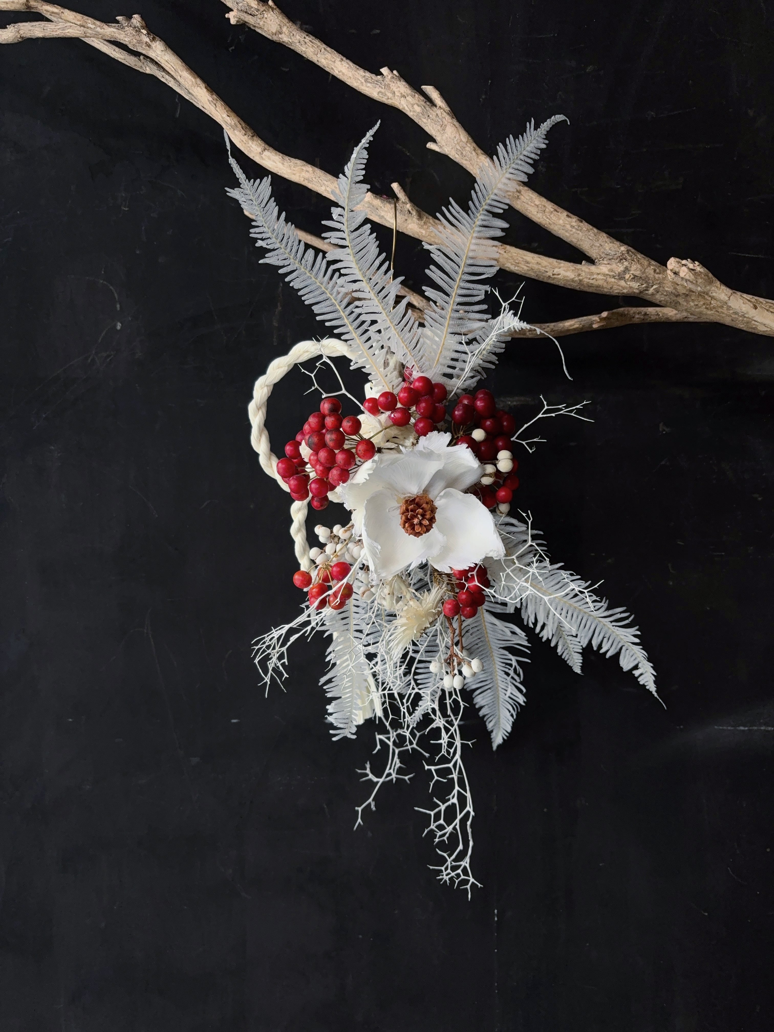 白をメインにサンキライをポイントにお正月らしく作成しました。
