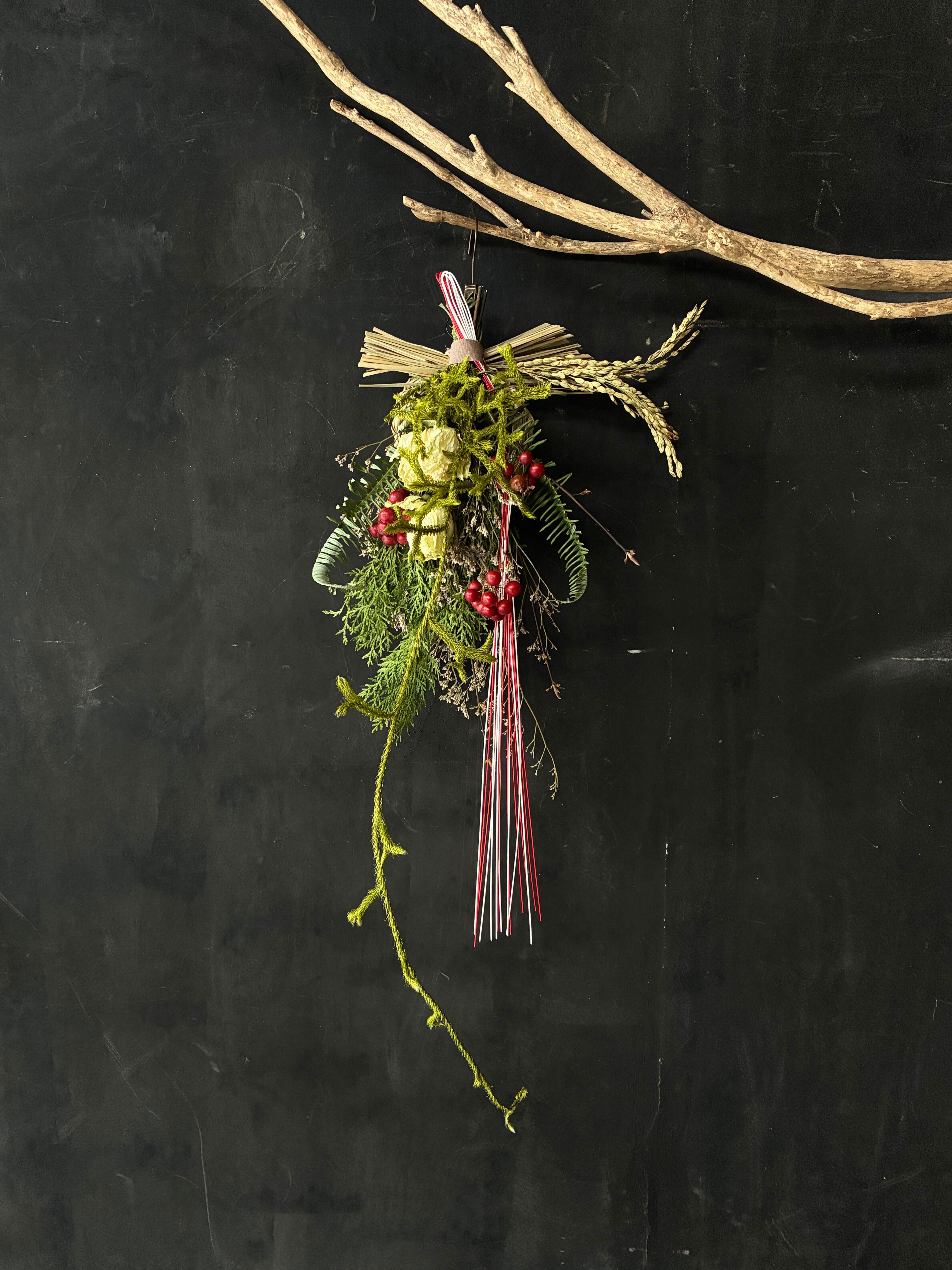 ヒカゲカズラで長さをだし、存在感のある仕上がりに