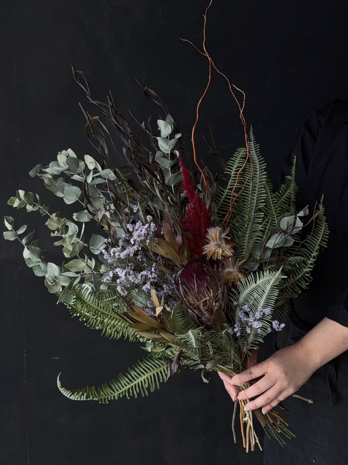プロテアを中心に落ち着きのある花材を使用して作成しました。