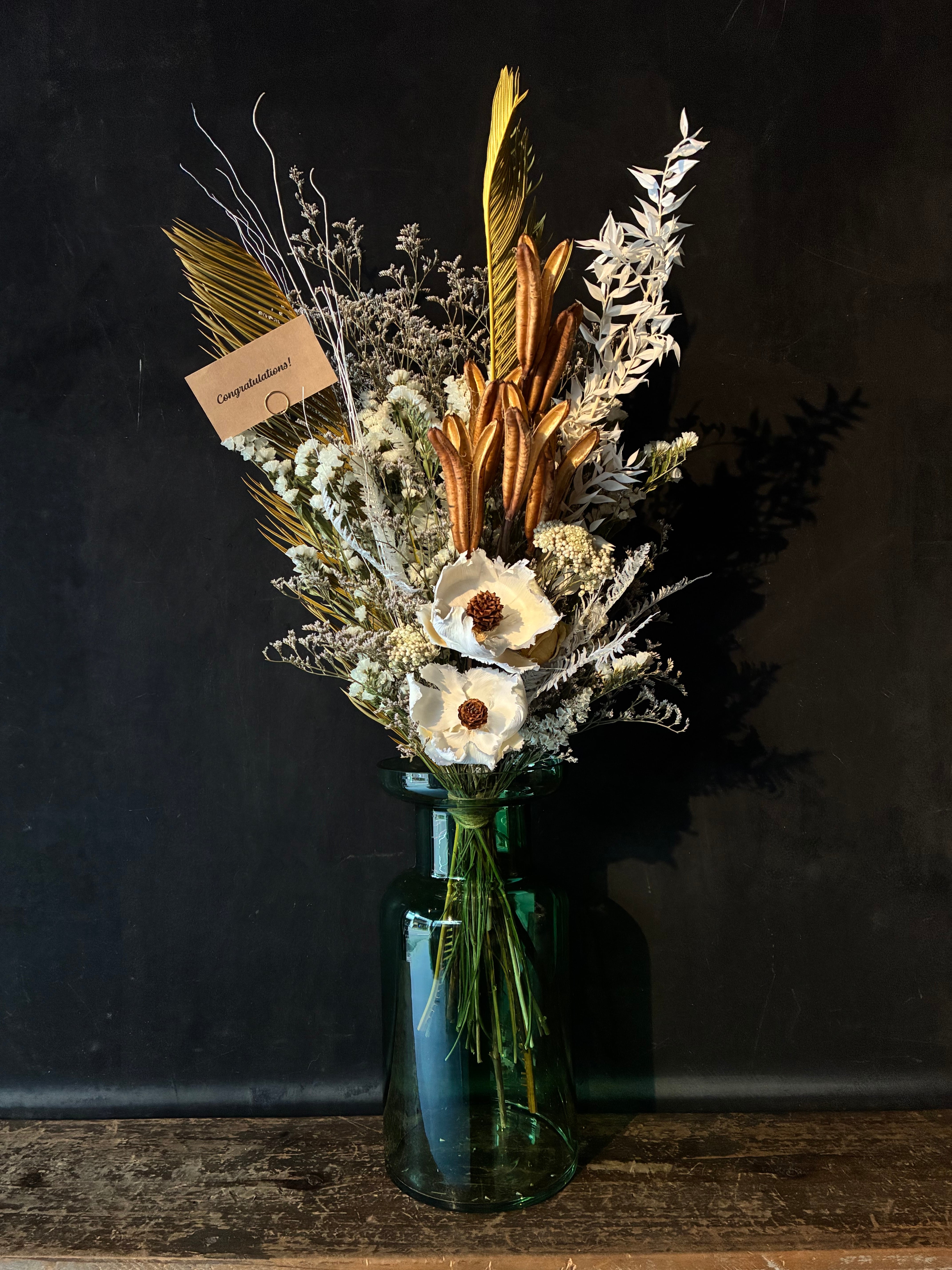 ドライフラワーはとてもデリケートな商品となってます。梱包には十分注意をしておりますが、配送中に花こぼれや多少の破損がある場合がございます。