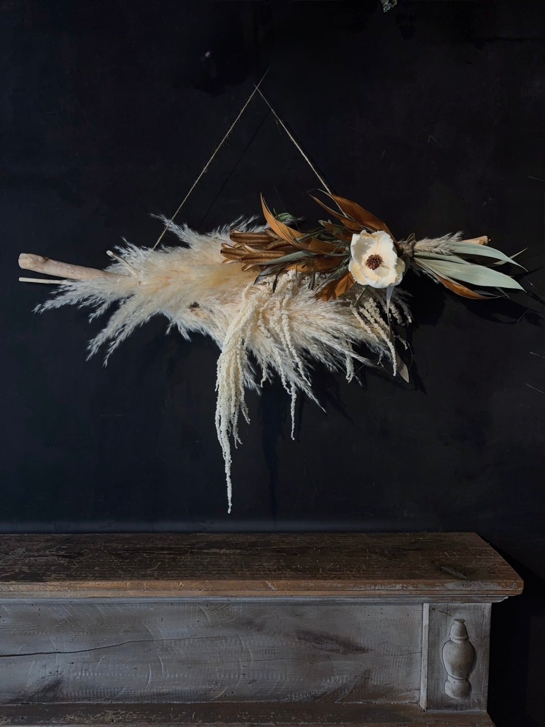 パンパスグラスをしっかり使用し、タペストリーの用に垂れ感じに飾っていただけるように作成しました。