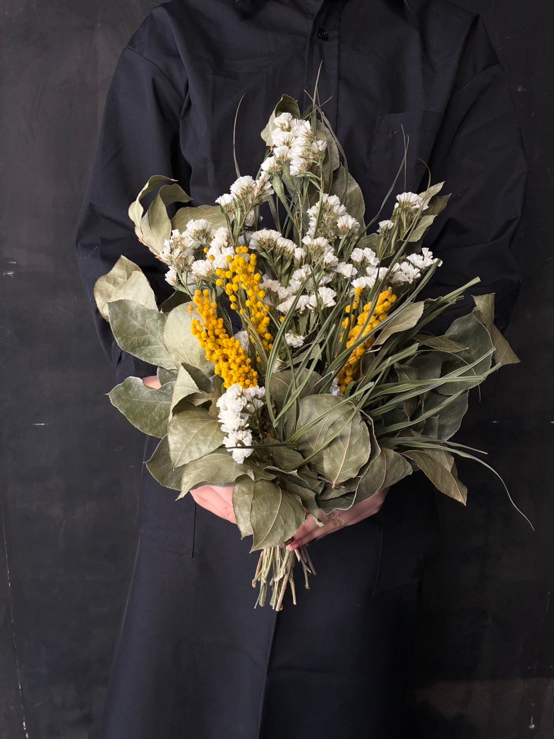 ミモザの優しい色合いとレモンリーフをメインにシンプルに仕上げました。