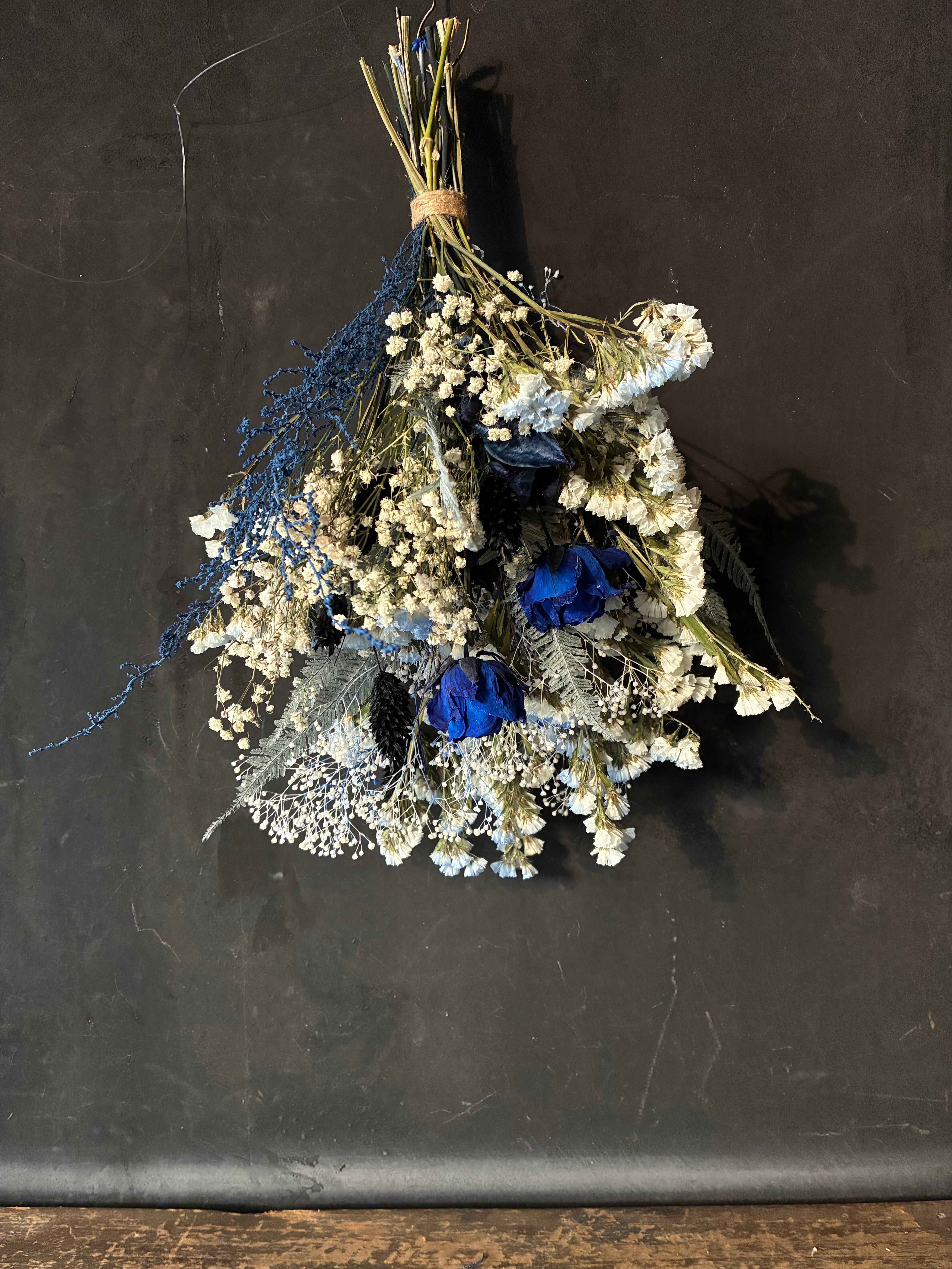 深い青色でまとめられたスワッグは、どんなお部屋にも落ち着いた雰囲気を与えてくれます。ブルーの花材で爽やかな印象
