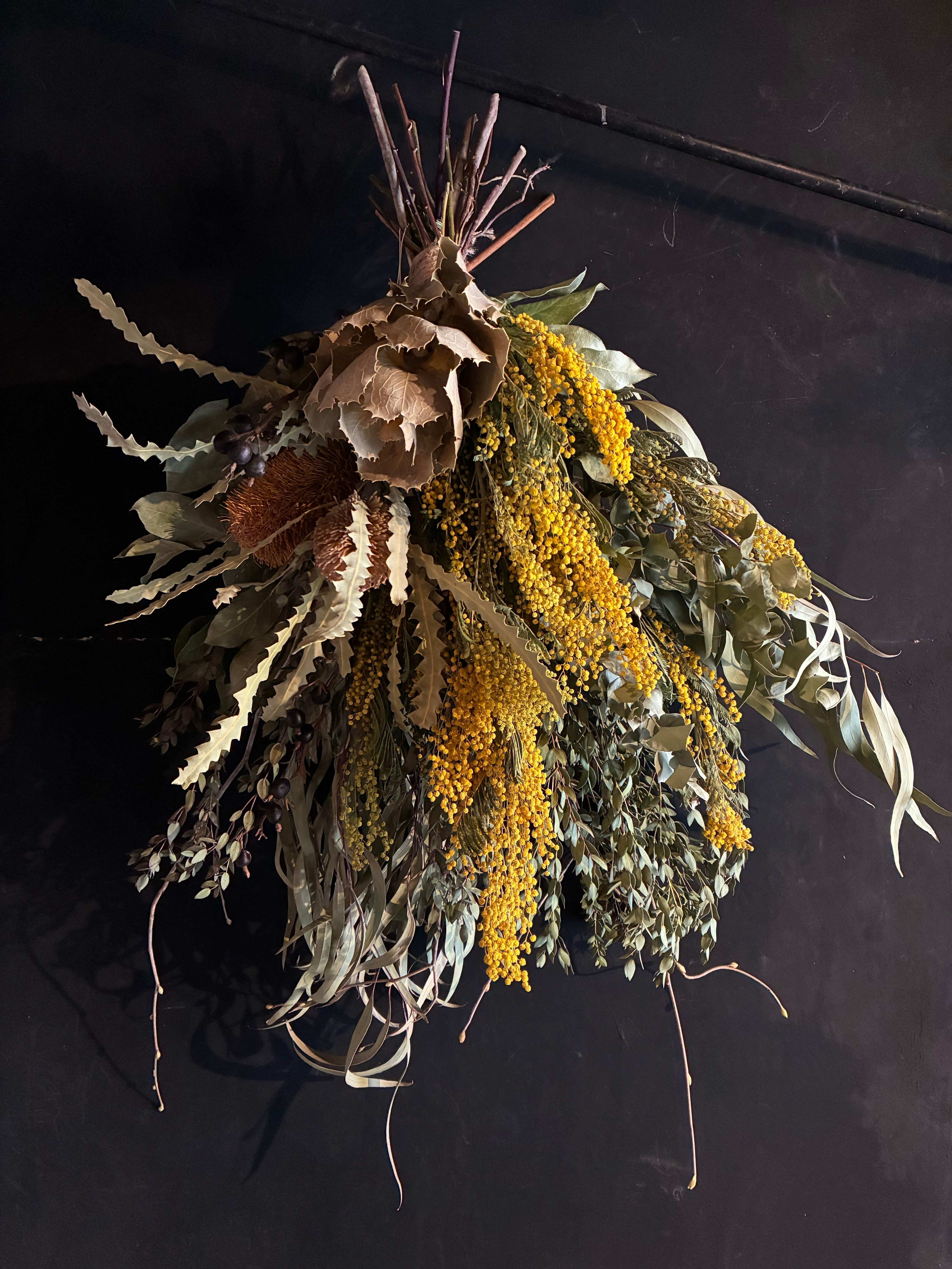 ミモザ、ハケアヴィクトリア、バンクシャをメインに存在感のあるスワッグ。