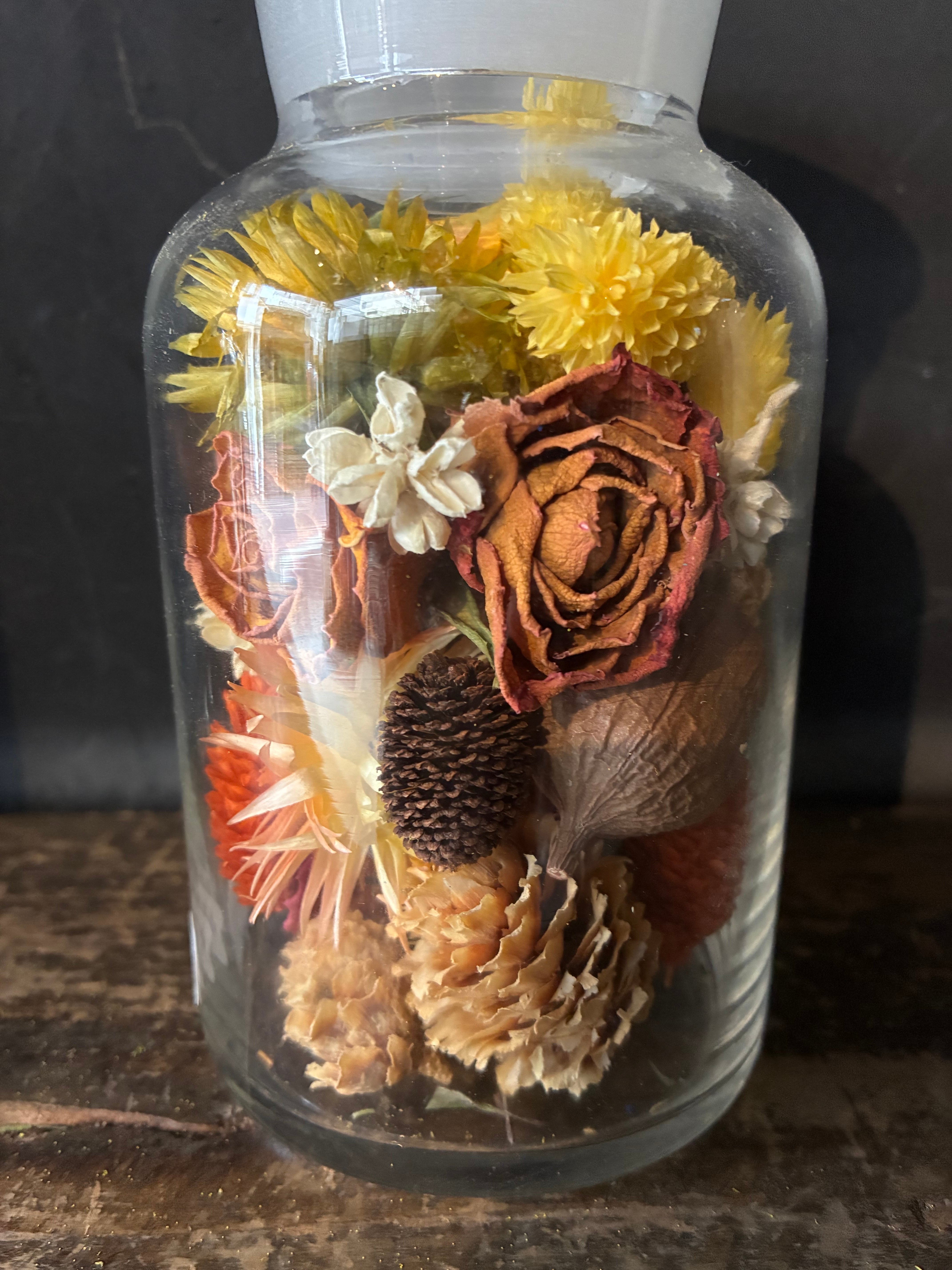 透明な薬瓶に花材を詰め込み、置くだけで様になるボトルフラワーにしました。