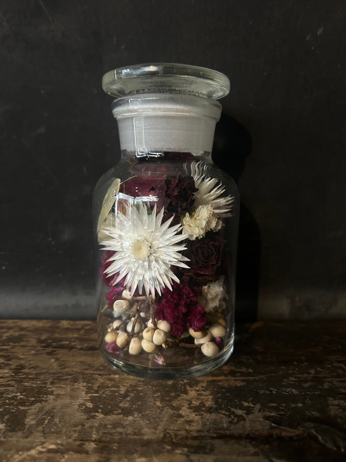 透明な薬瓶に花材を詰め込み、置くだけで様になるボトルフラワーにしました。