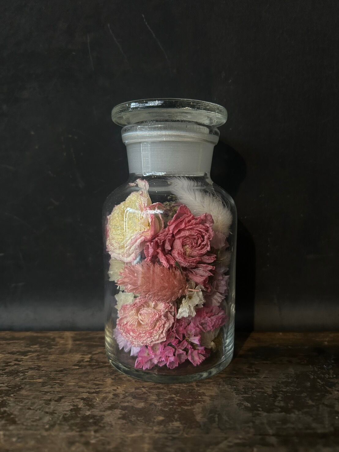 透明な薬瓶に花材を詰め込み、置くだけで様になるボトルフラワーにしました。