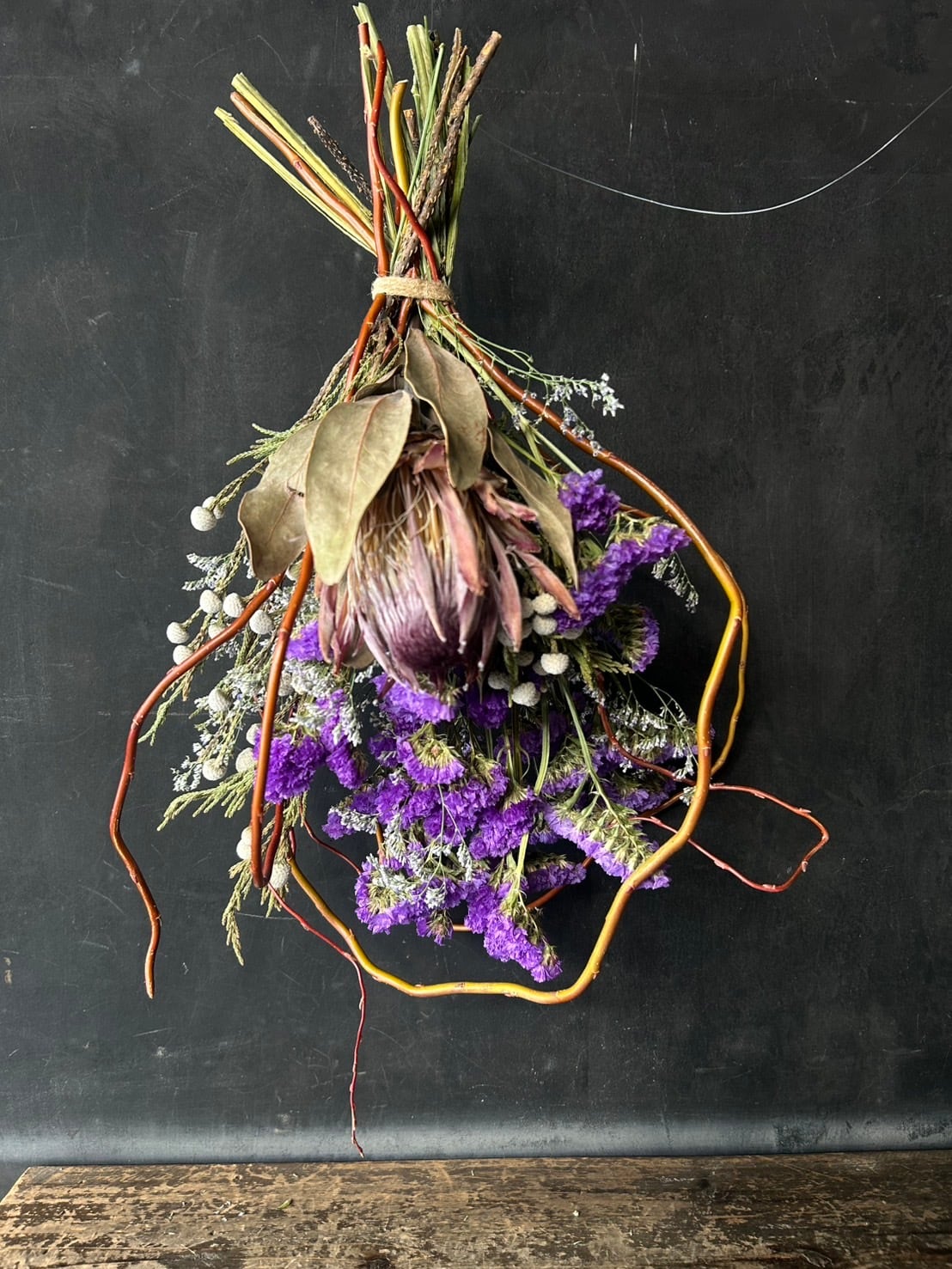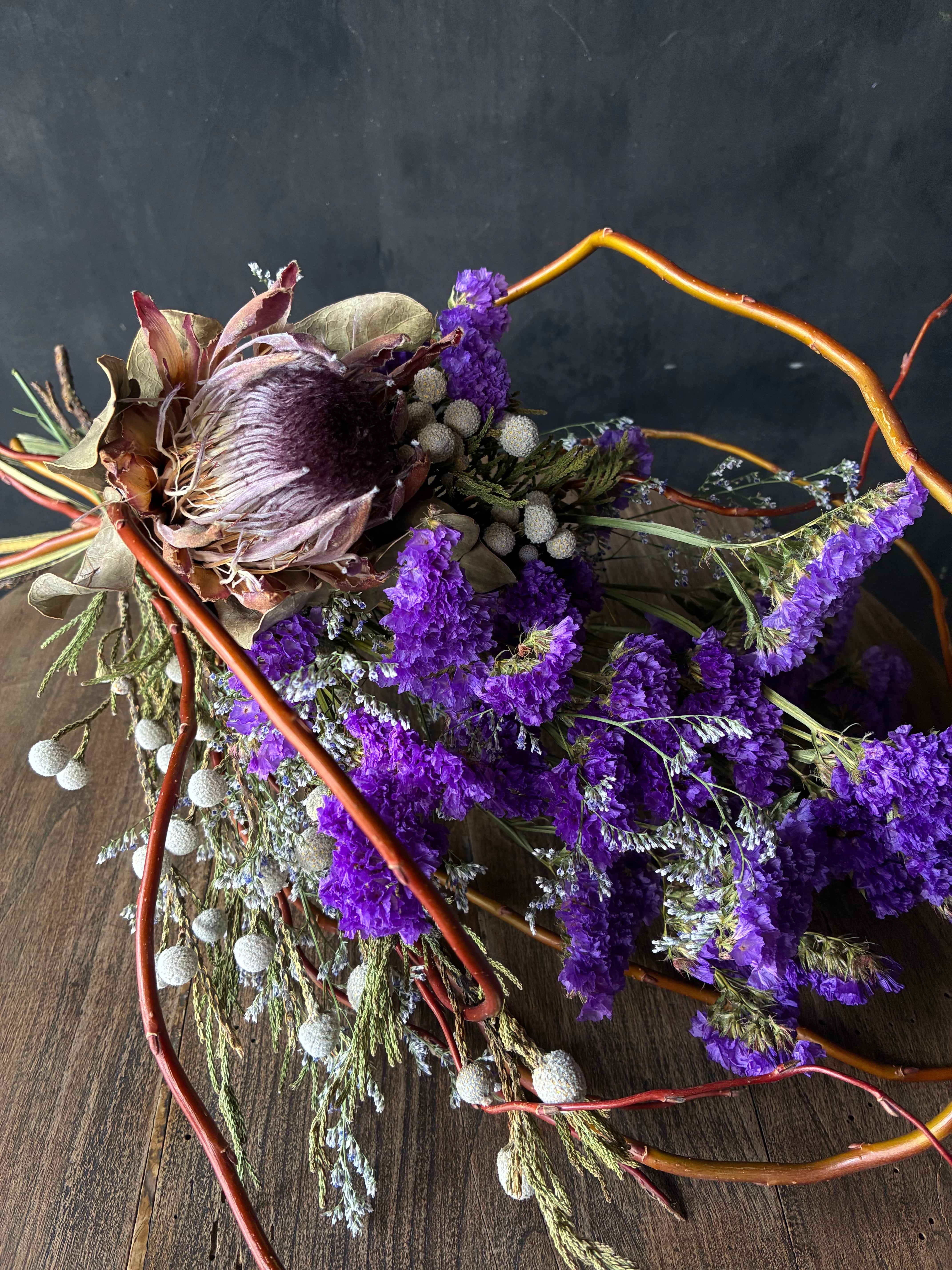 色鮮やかに仕上がったスターチスの紫をメインに紅ツルで動きを出したスワッグです。