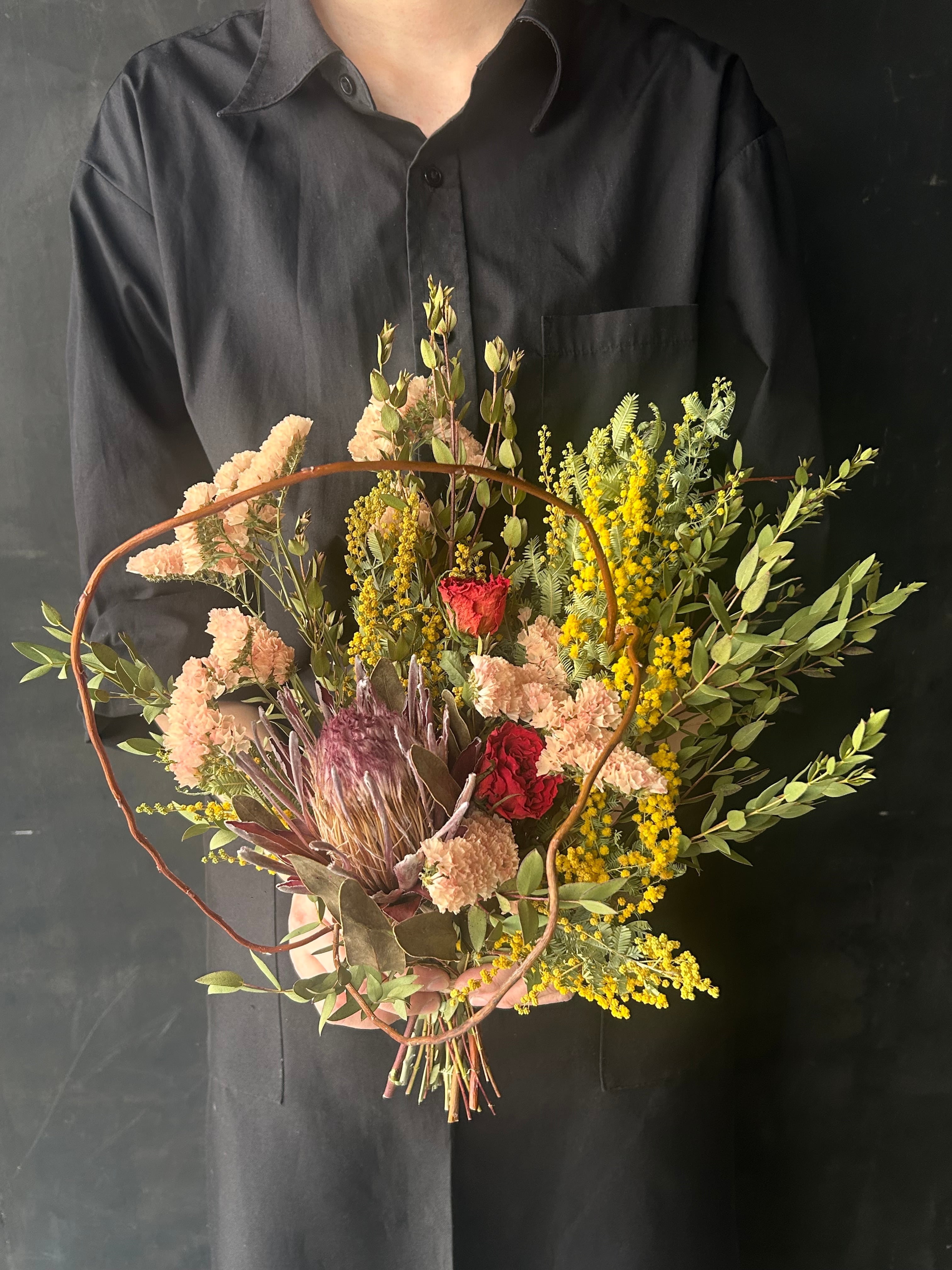 プロテア ミモザ 薔薇 スターチス ユーカリ 紅ツル