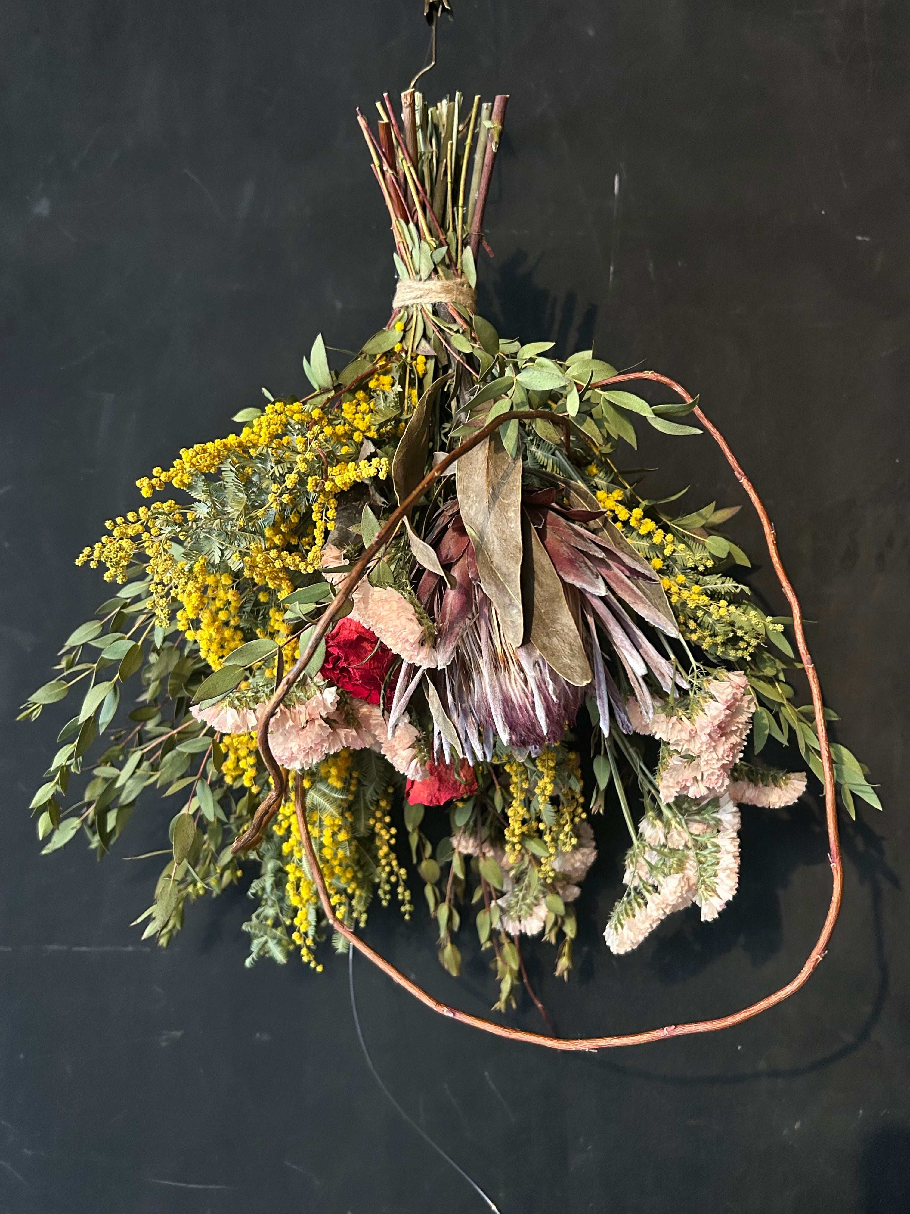 プロテアをメインにミモザ薔薇と明るくまとめたスワッグです。