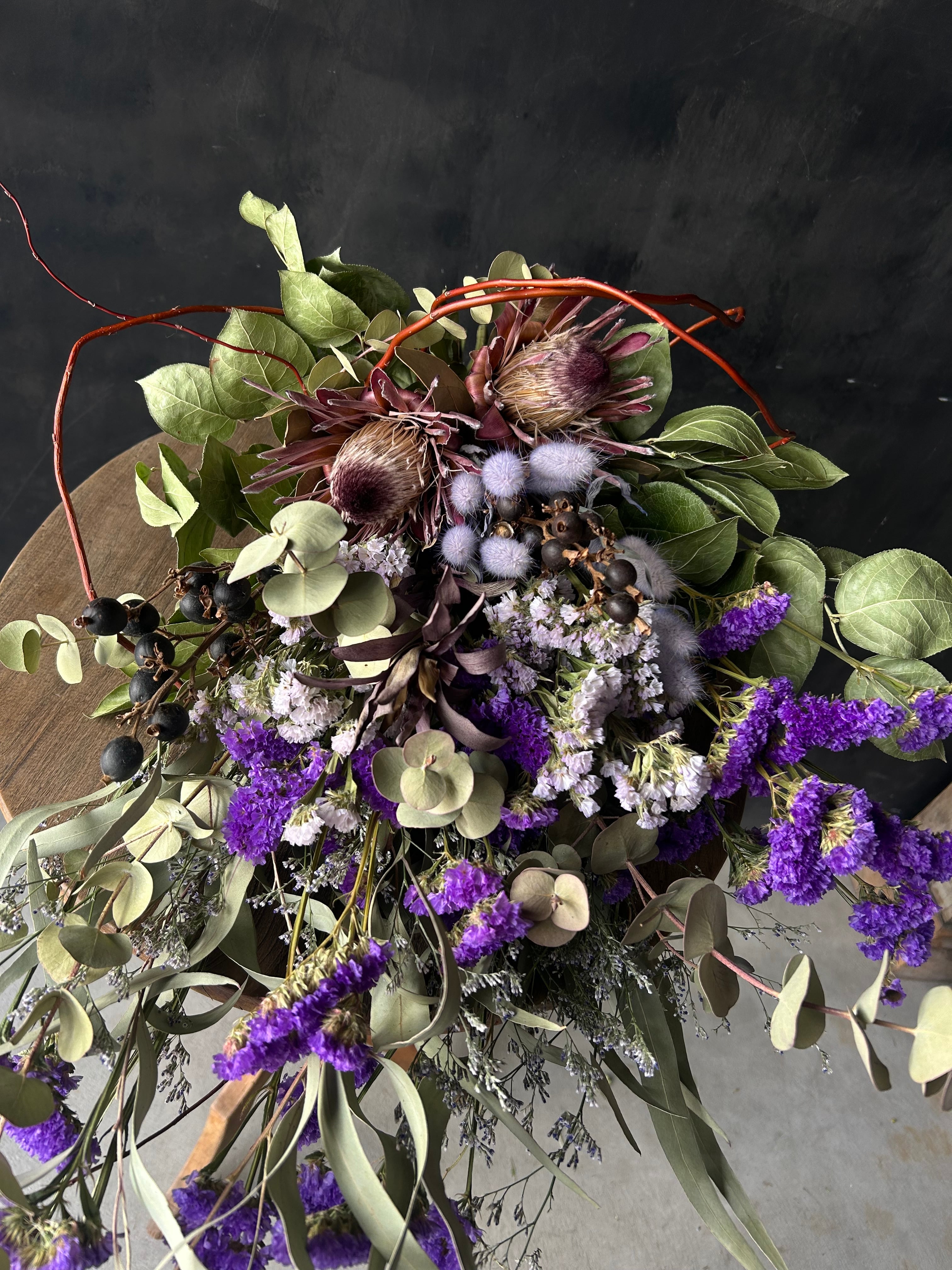 鮮やかなスターチスの紫を使用し、プロテアをメインに存在感のあるスワッグに仕上げました。