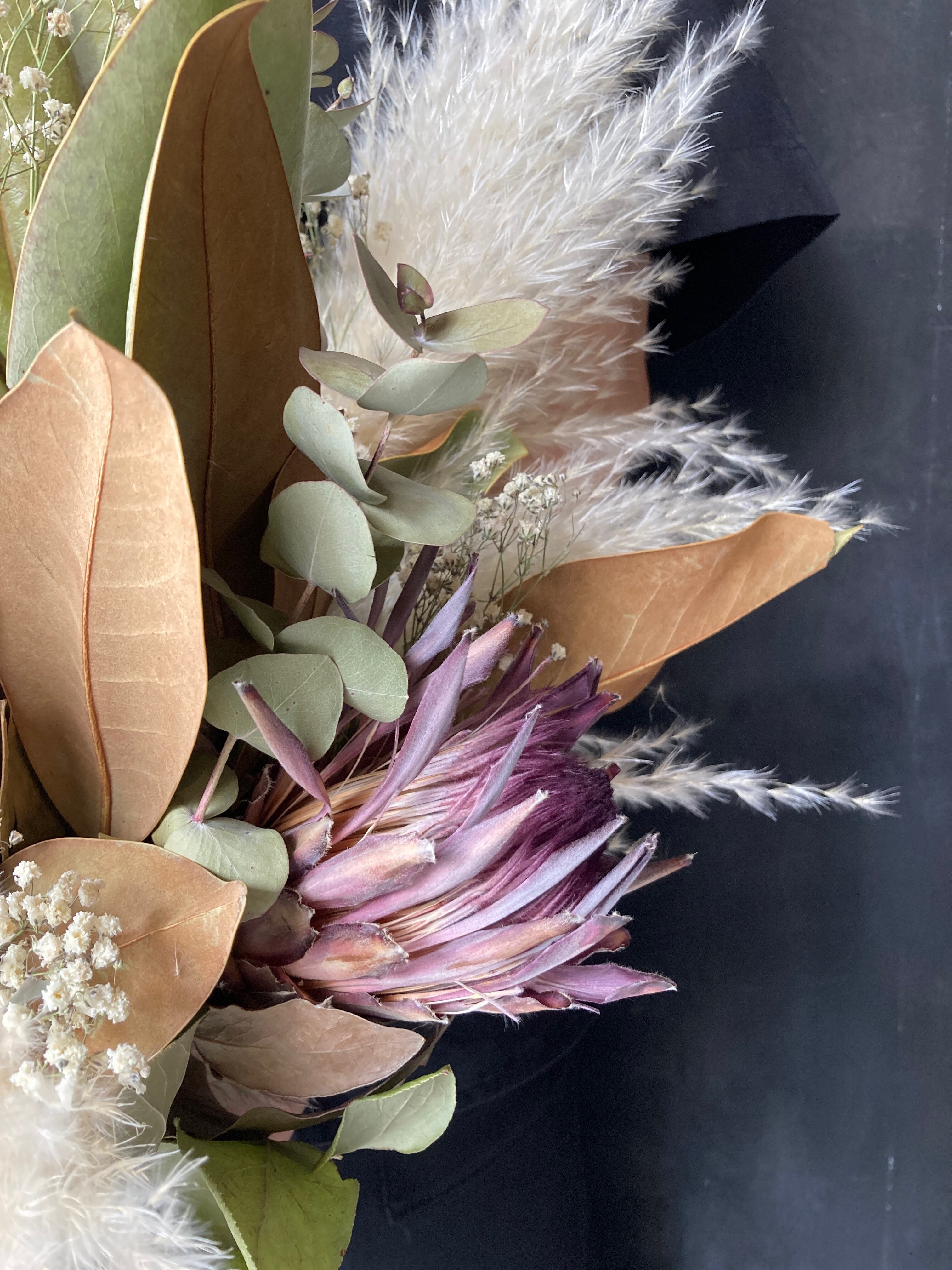 キングプロテア、プロテア、パームフラワー、ベルガムナッツ、カスミソウ、タイサンボク、ユーカリ、パンパスグラスを使用したベージュベースの華やかなスワッグです。