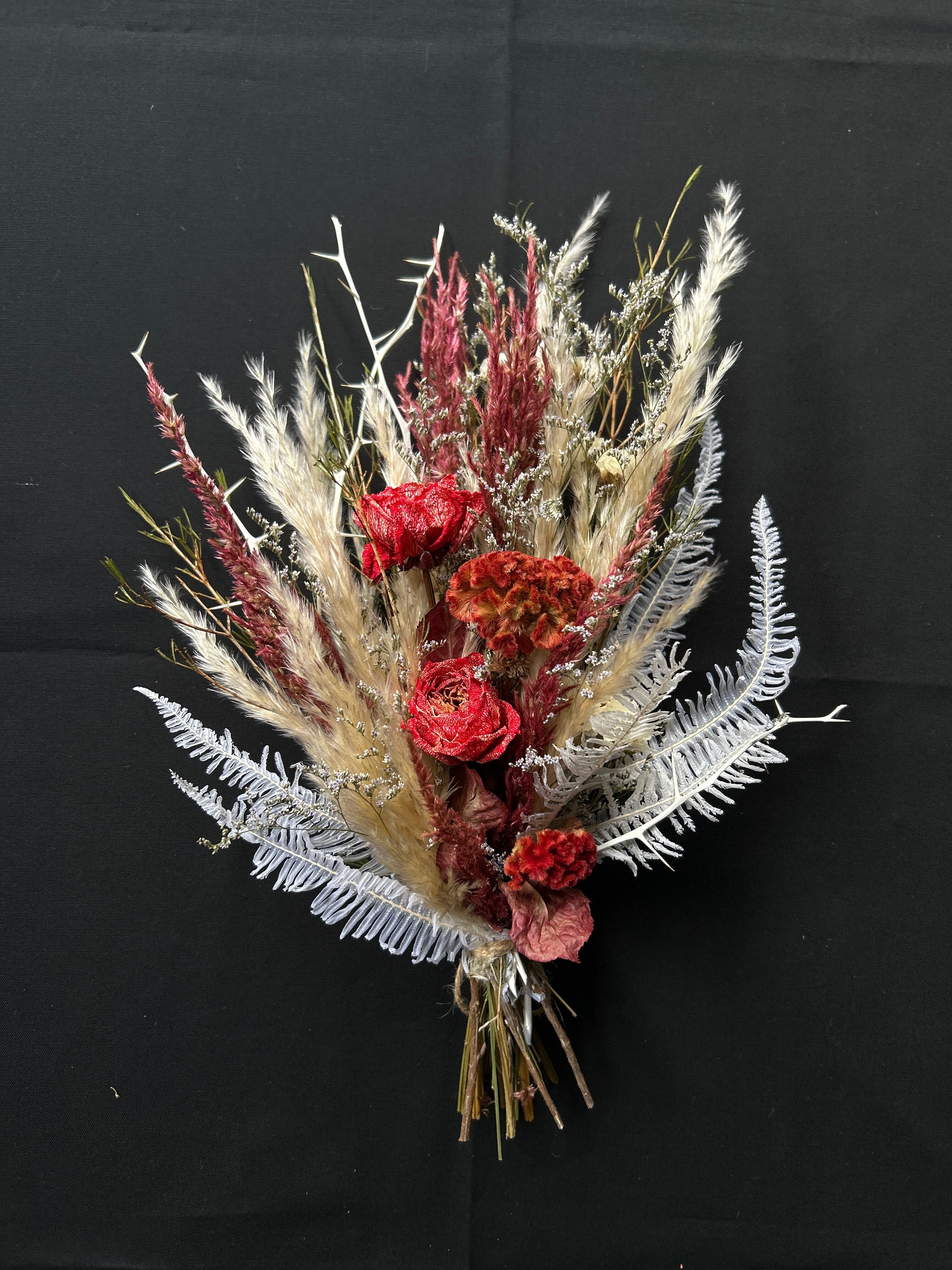 バラ、ケイトウ、スターチスブルーウェーブ、パンパスグラス、シダ、カラタチ