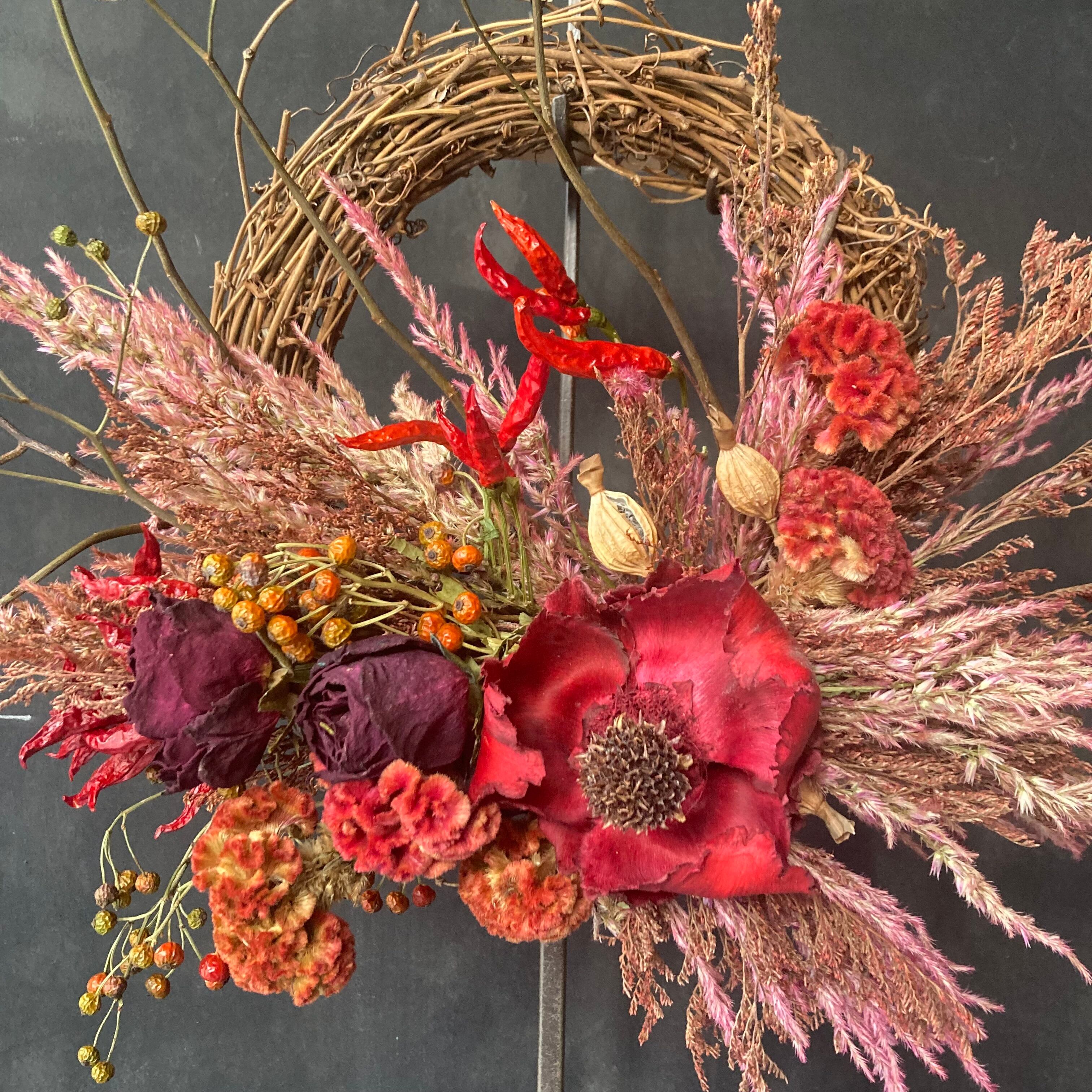 野ばらの実、パームフラワー、赤バラ、トウガラシ、ケイトウ、ゲットウ