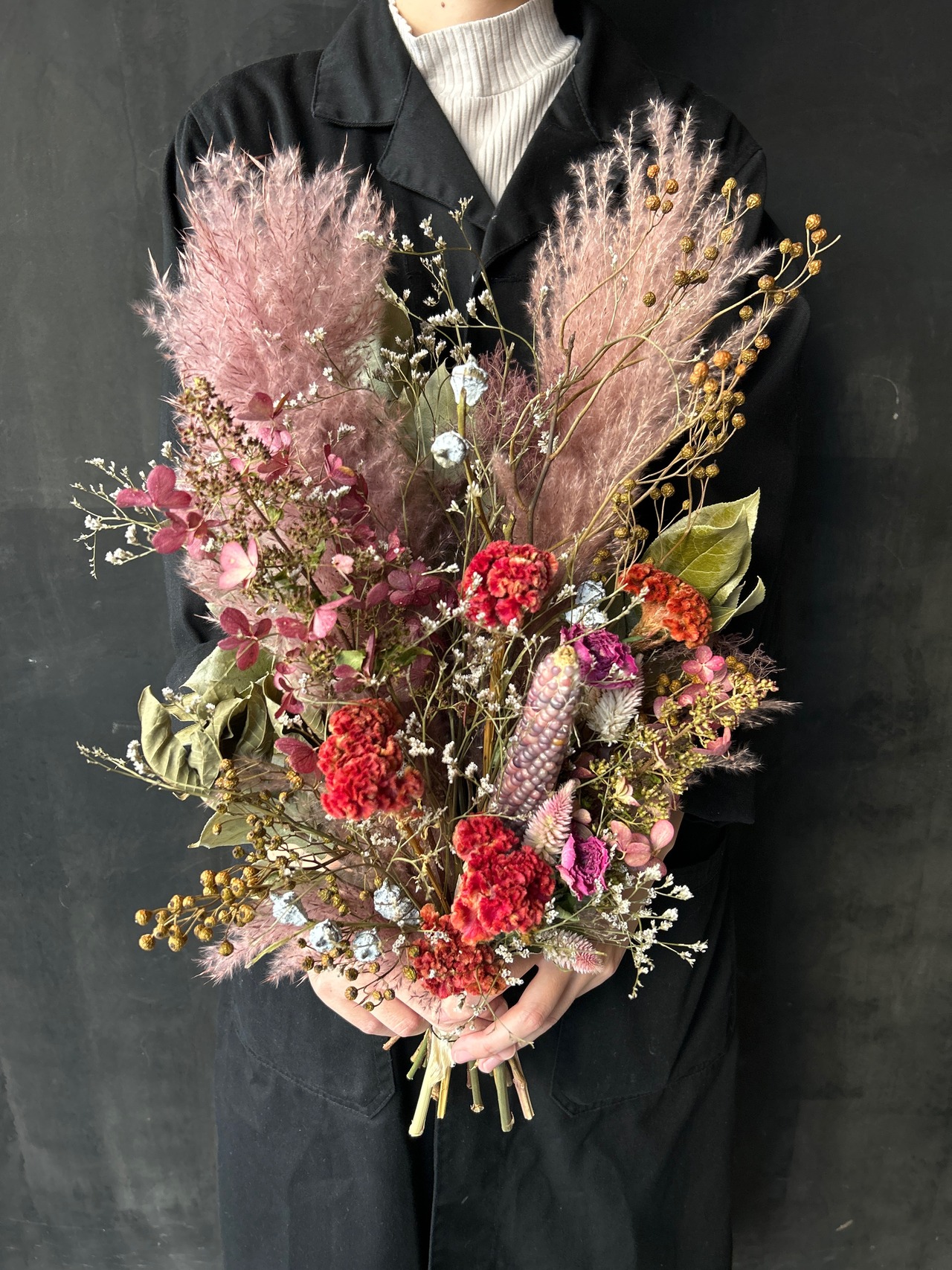 赤系の花材を使ったスワッグです。ドライならではの渋さも相まって格好良くまとめました。花材によって違う赤の色味をお楽しみください。