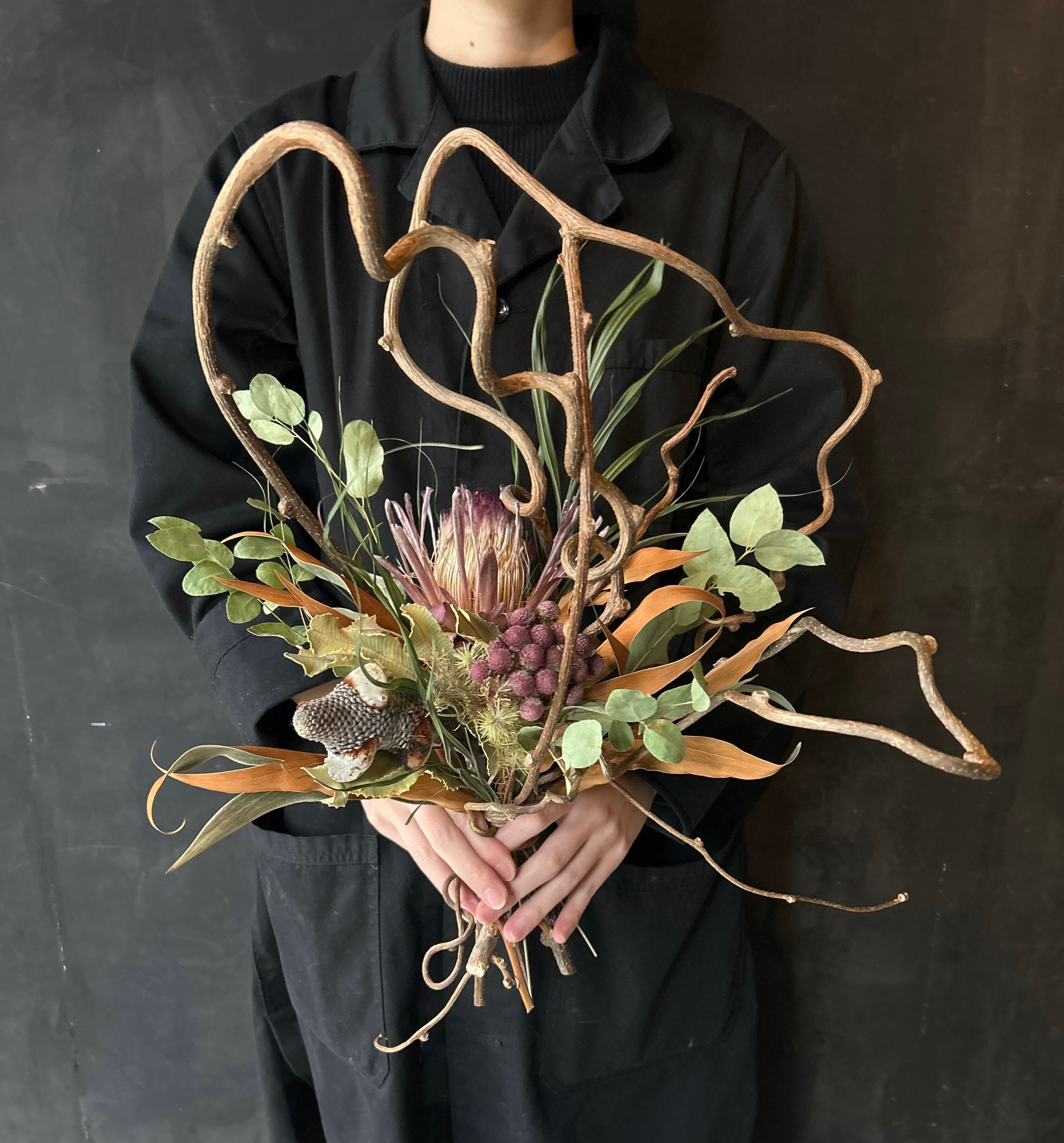 プロテアなどの大きめの花材を集め、キウイのツルで大きく動きをつけたスワッグ。