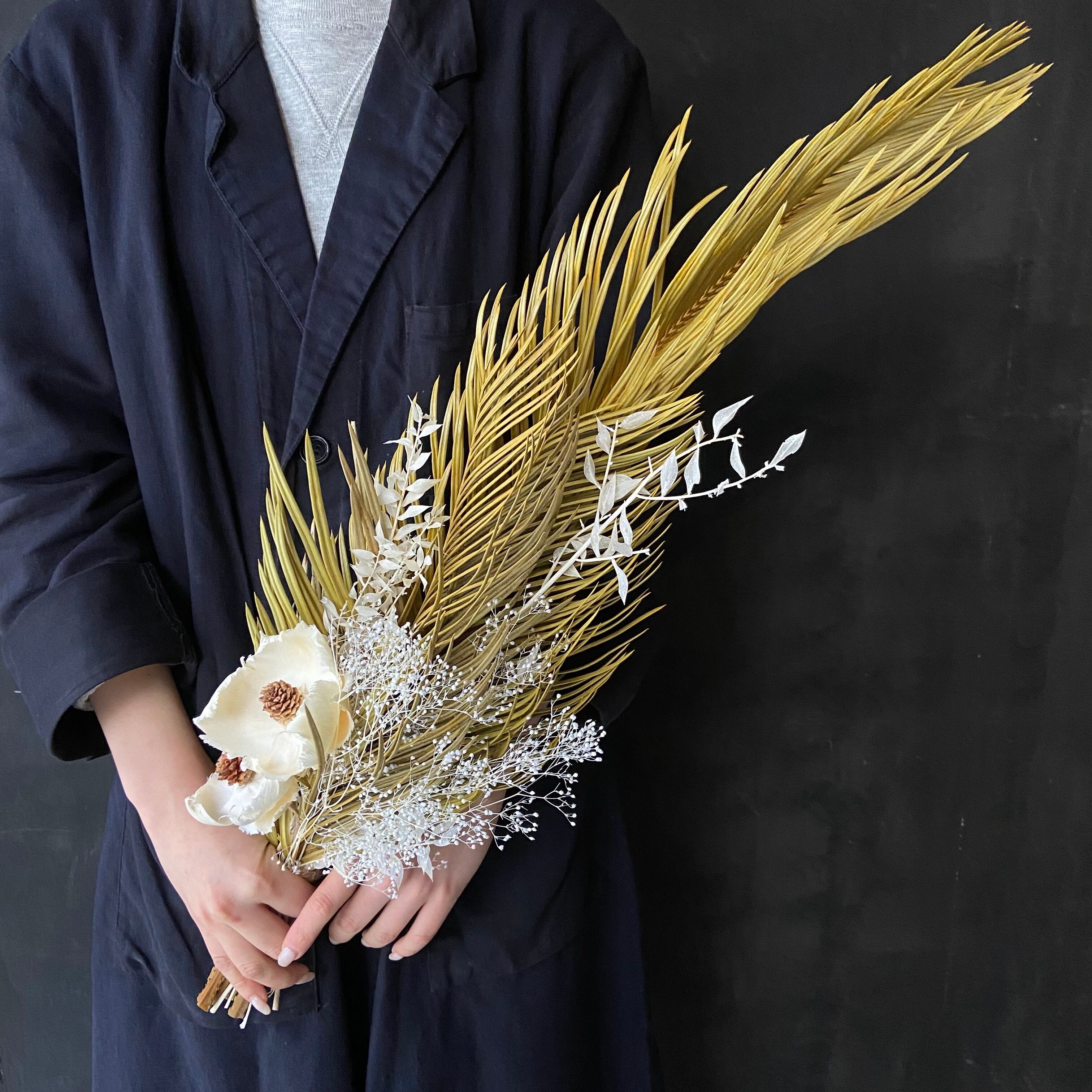 パームフラワーにソテツを合わせたシンプルなスワッグ。ソフトカスミソウやラスカスで華やかさをプラスしました。