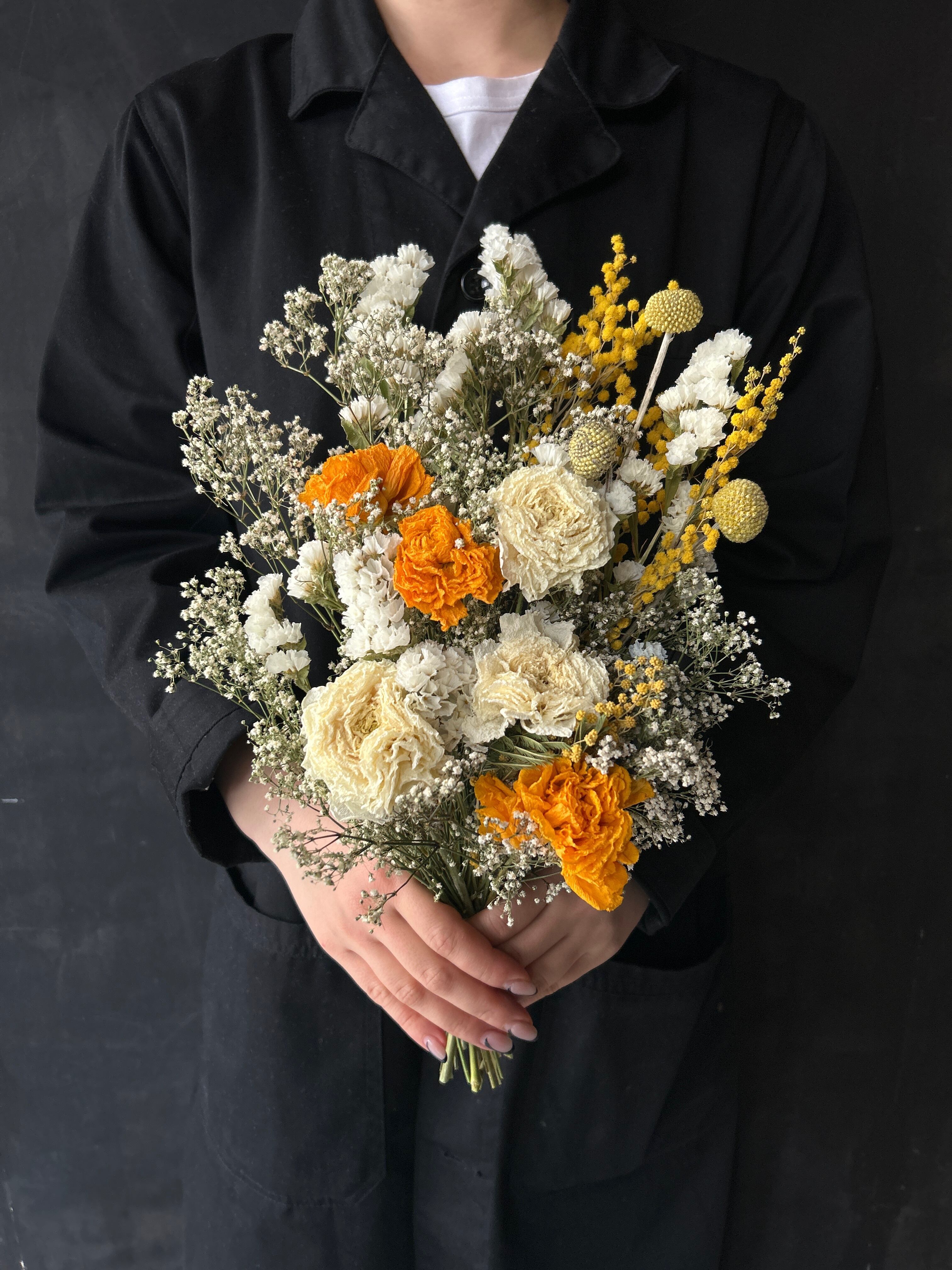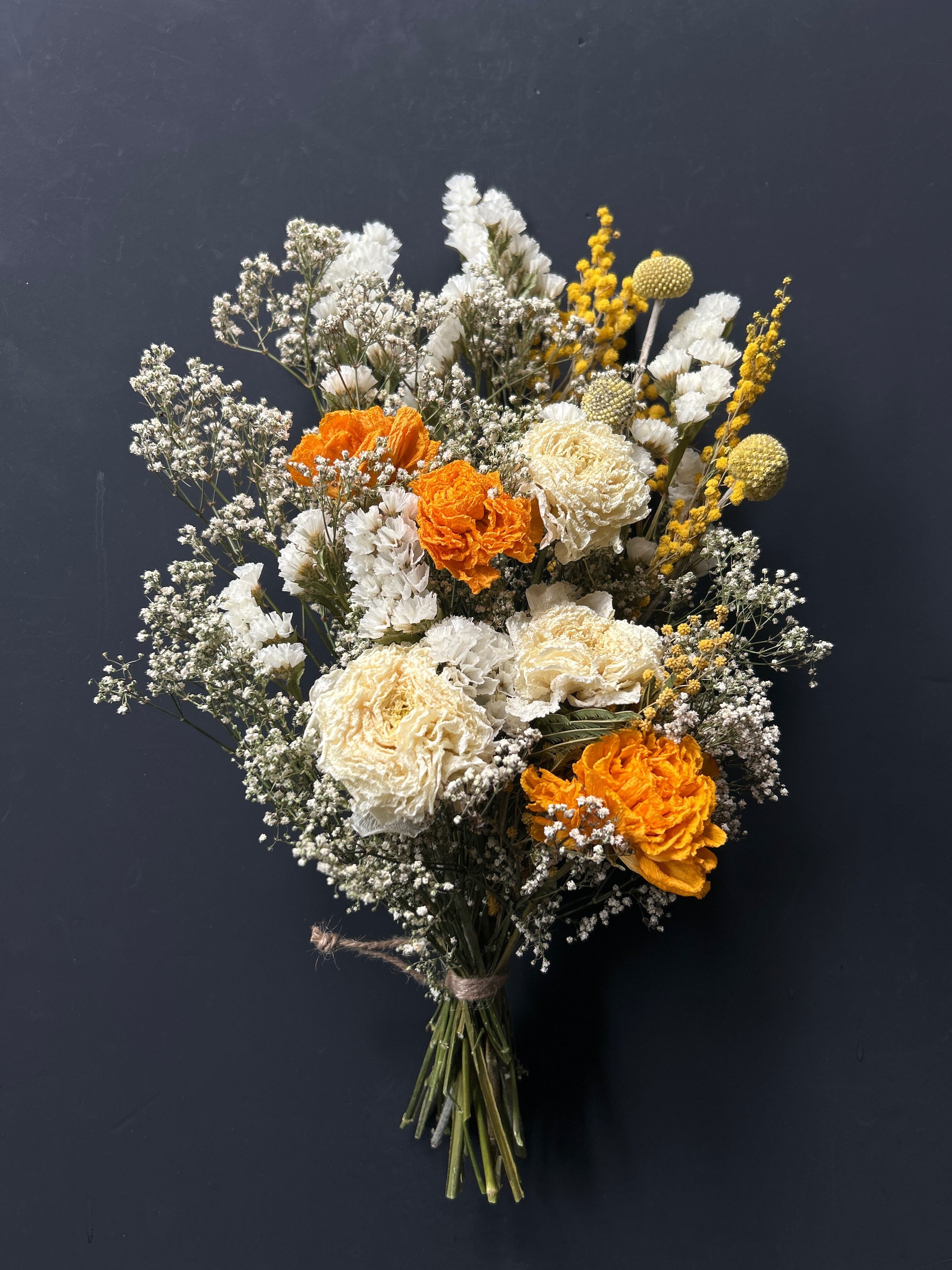 ラナンキュラス、クラスペディア、スターチス、カスミソウ、ミモザ