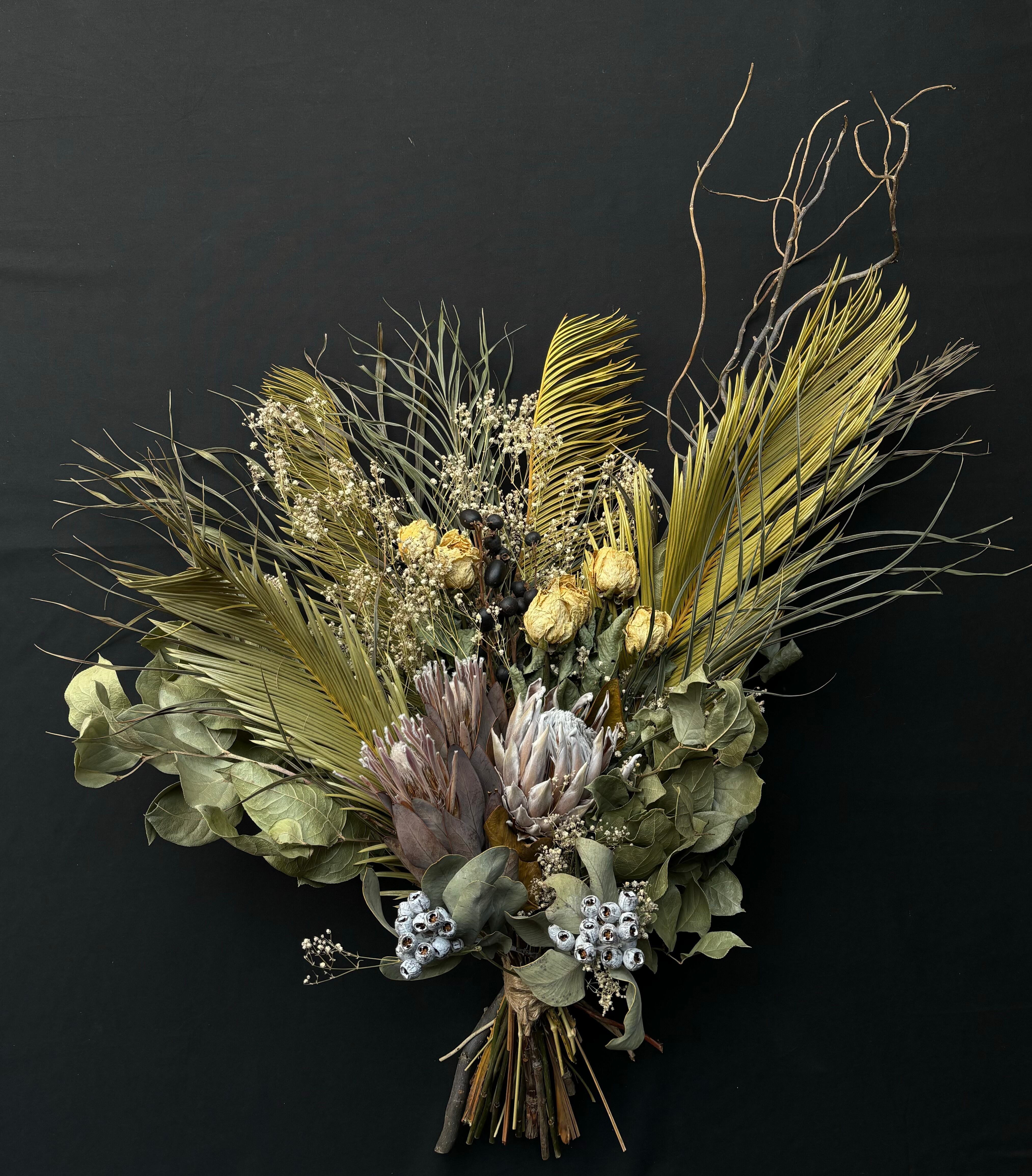 キングプロテア、プロテア、バラ、カスミソウ、ブラックベリー、テトラゴナ、レモンリーフ、ソテツ、ウンリュウヤナギ、ヤシ