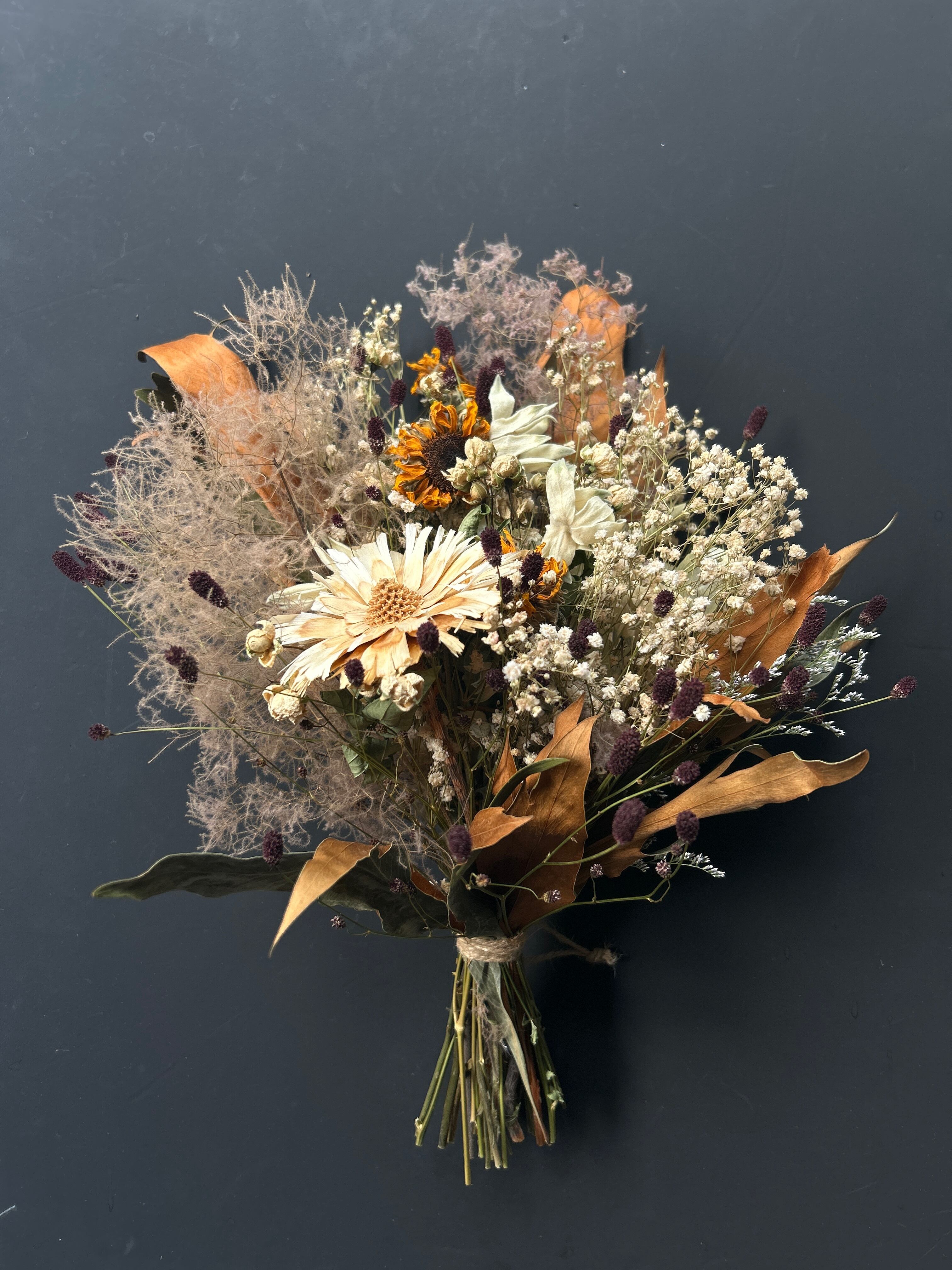 ロゼッタ、ヒマワリ、フランネルフラワー、バラ、ワレモコウ、カスミソウ、スモークツリー、グレヴィリア