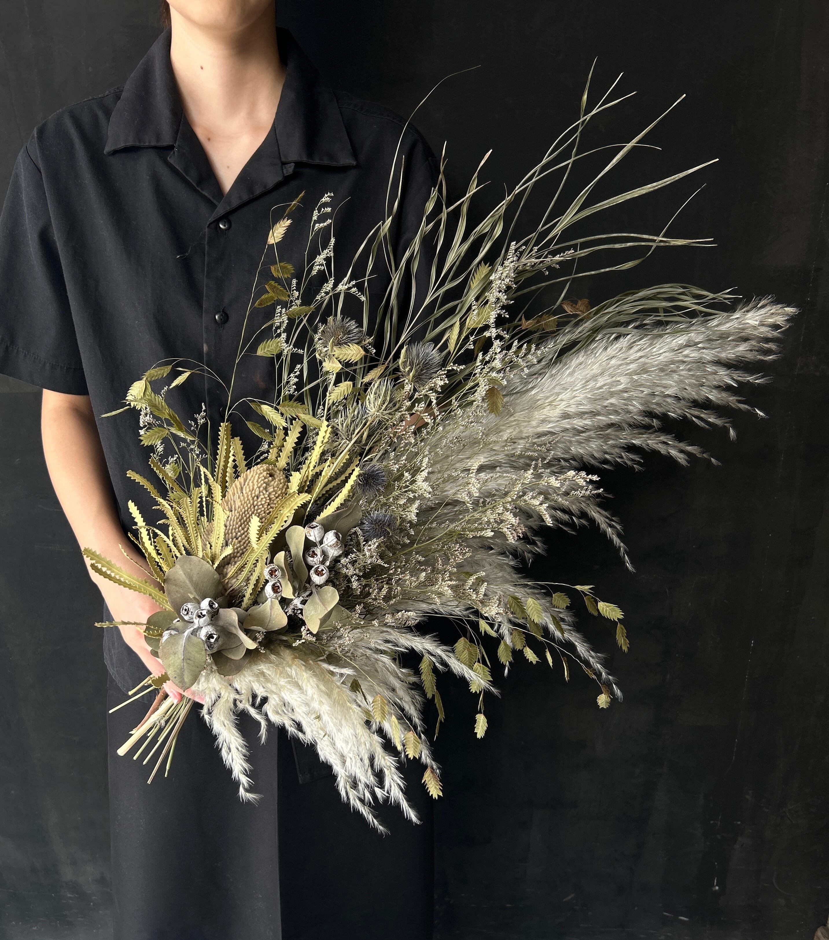 バンクシア、テトラゴナ、エリンジウム、スターチスブルーウェーブ、ワイルドオーツ、ヤシ、パンパスグラス