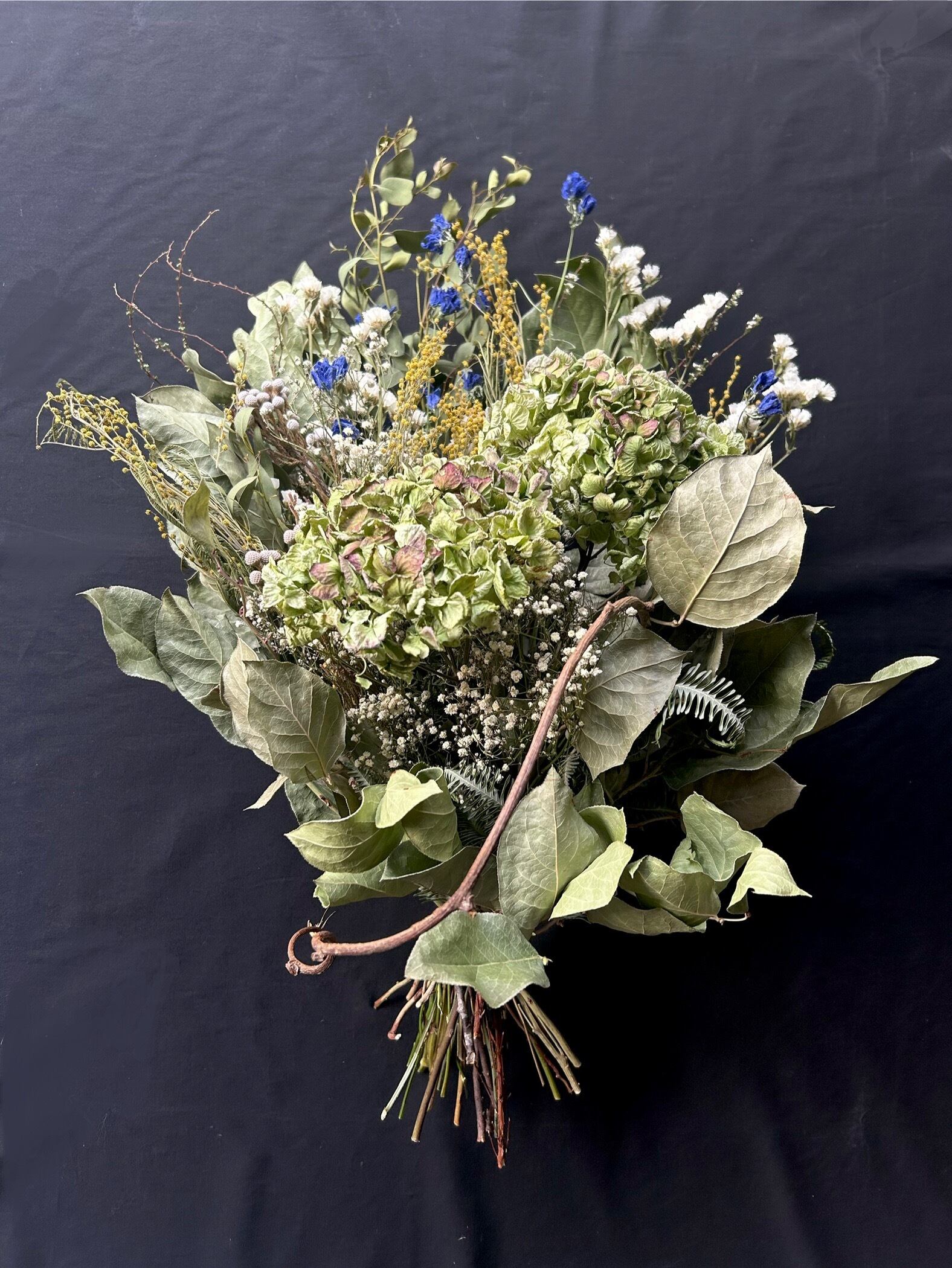 アジサイ、ミモザ、デルフィニウム、ブルニア、カスミソウ、シダ、ユキヤナギ、スターチス、ユーカリ、レモンリーフ、キウイのツル